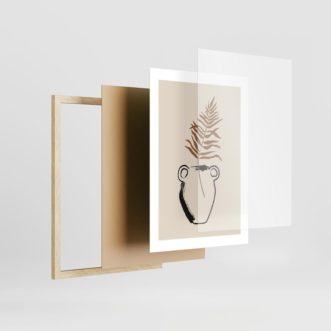 Ten plakat łączy ducha boho z nowoczesną sztuką, prezentując antyczny wazon z delikatnie umieszczoną palmą w minimalistycznym otoczeniu. Sztuka ta tworzy wyjątkową równowagę pomiędzy różnymi stylami, wprowadzając do Twojej przestrzeni artystyczny akcent, który jednocześnie ożywia i uspokaja, oddając esencję piękna natury i estetyki.
