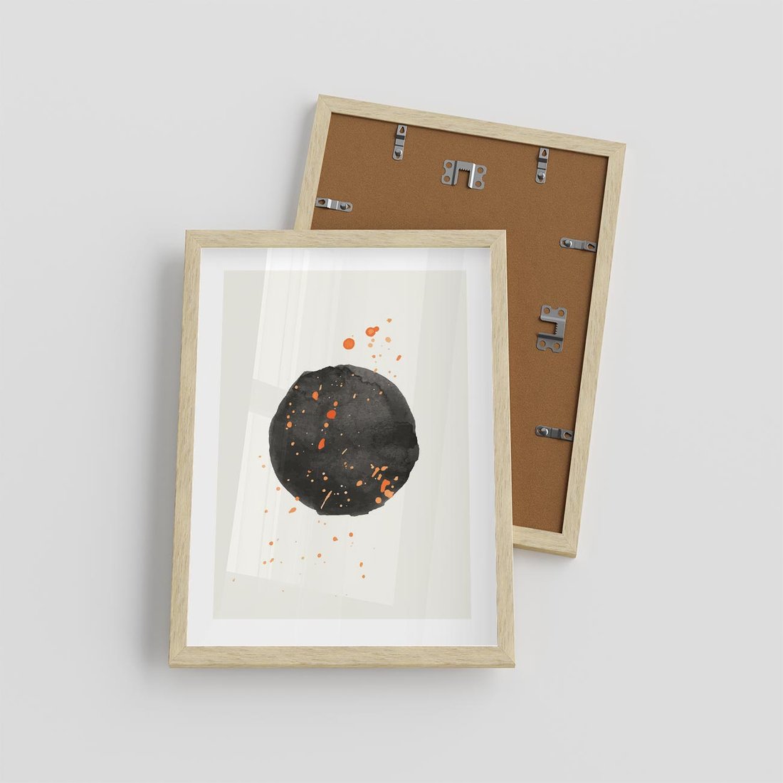 Oryginalny obraz to połączenie abstrakcyjnej czarnej plamy z delikatnie rozsianymi pomarańczowymi kropkami. Minimalistyczny styl i mocny akcent tworzą wyjątkową nowoczesną sztukę.