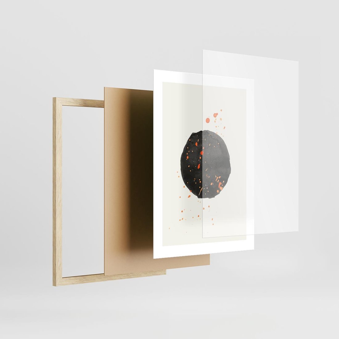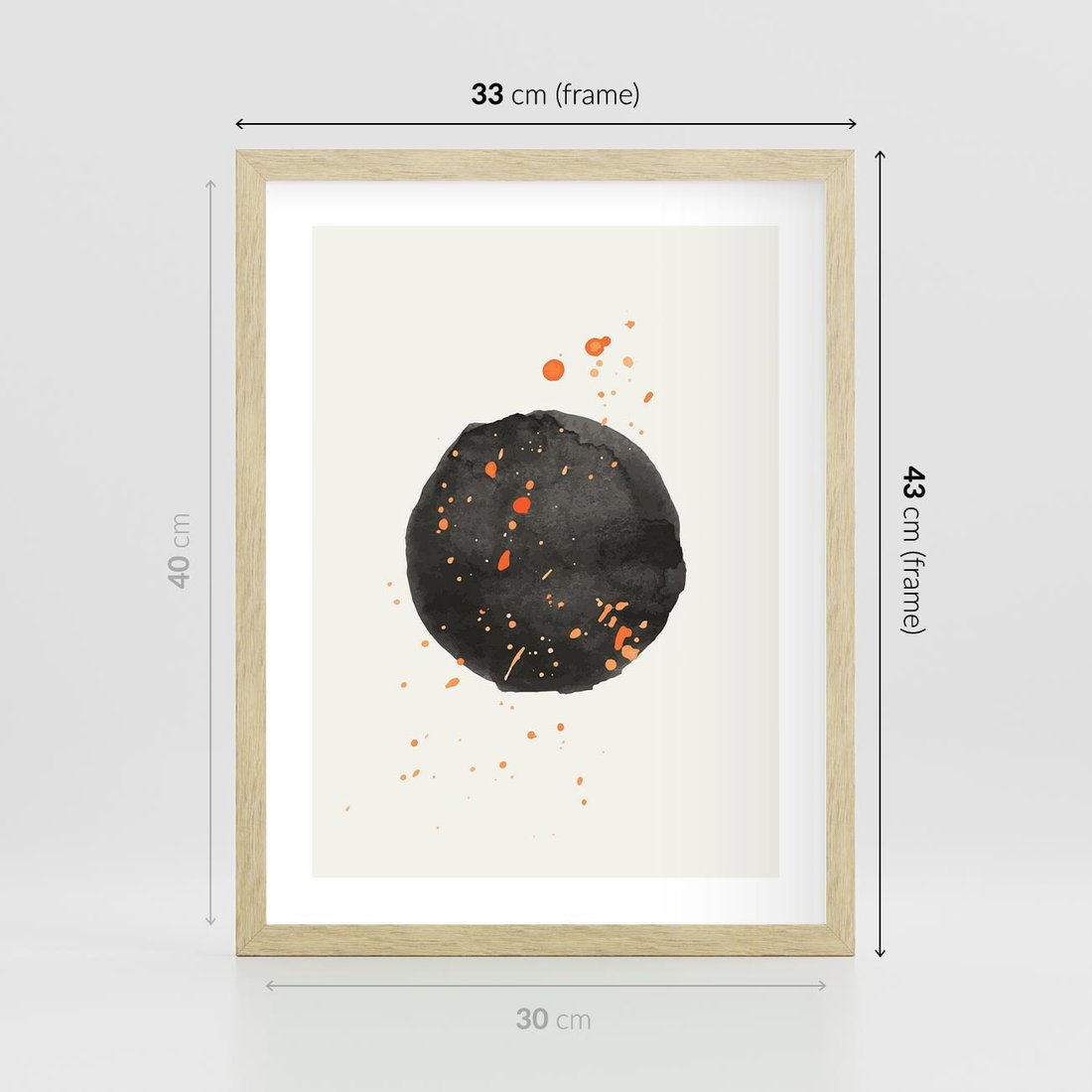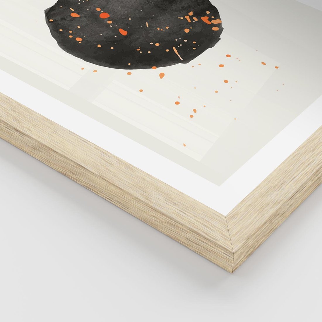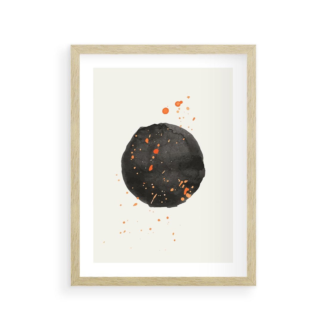 Plakat w ramie 30x40 - Wibracje Kolorów - abstrakcyjna czarna plama, rozsiane pomarańczowe kropki - rama drewno