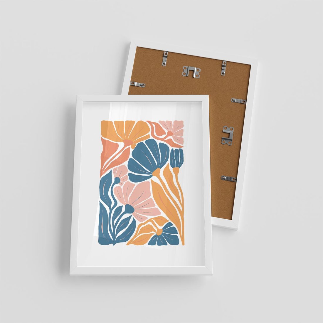 Ta nowoczesna grafika w pastelowych odcieniach niebieskiego, pomarańczowego i różowego ożywia przestrzeń kwiatowym urokiem. To dynamiczna kompozycja, która wnosi do wnętrza subtelne i radosne akcenty. Obraz ten jest wspaniałym sposobem na wprowadzenie kolorowej i nowoczesnej energii natury do Twojego otoczenia.
