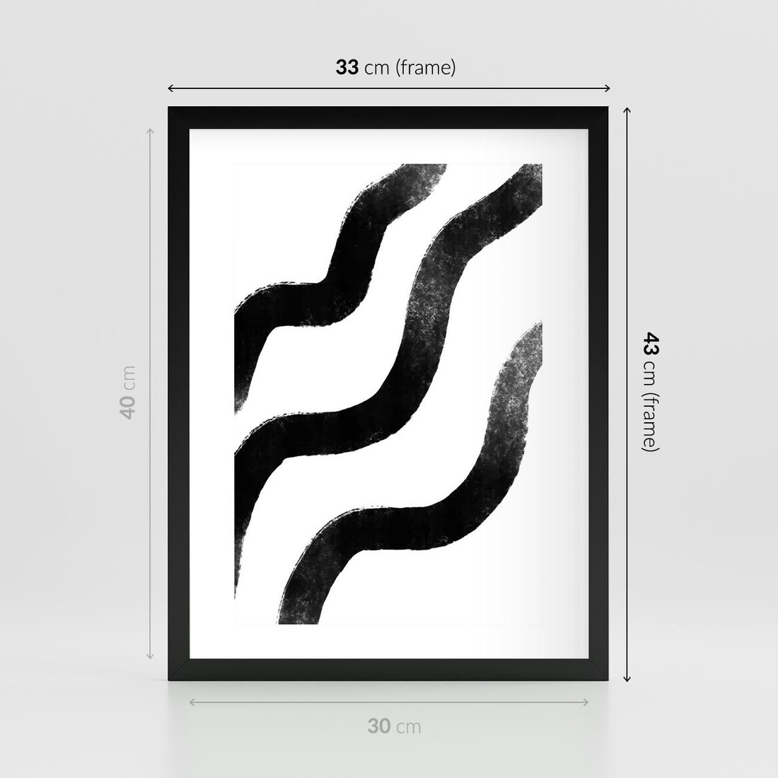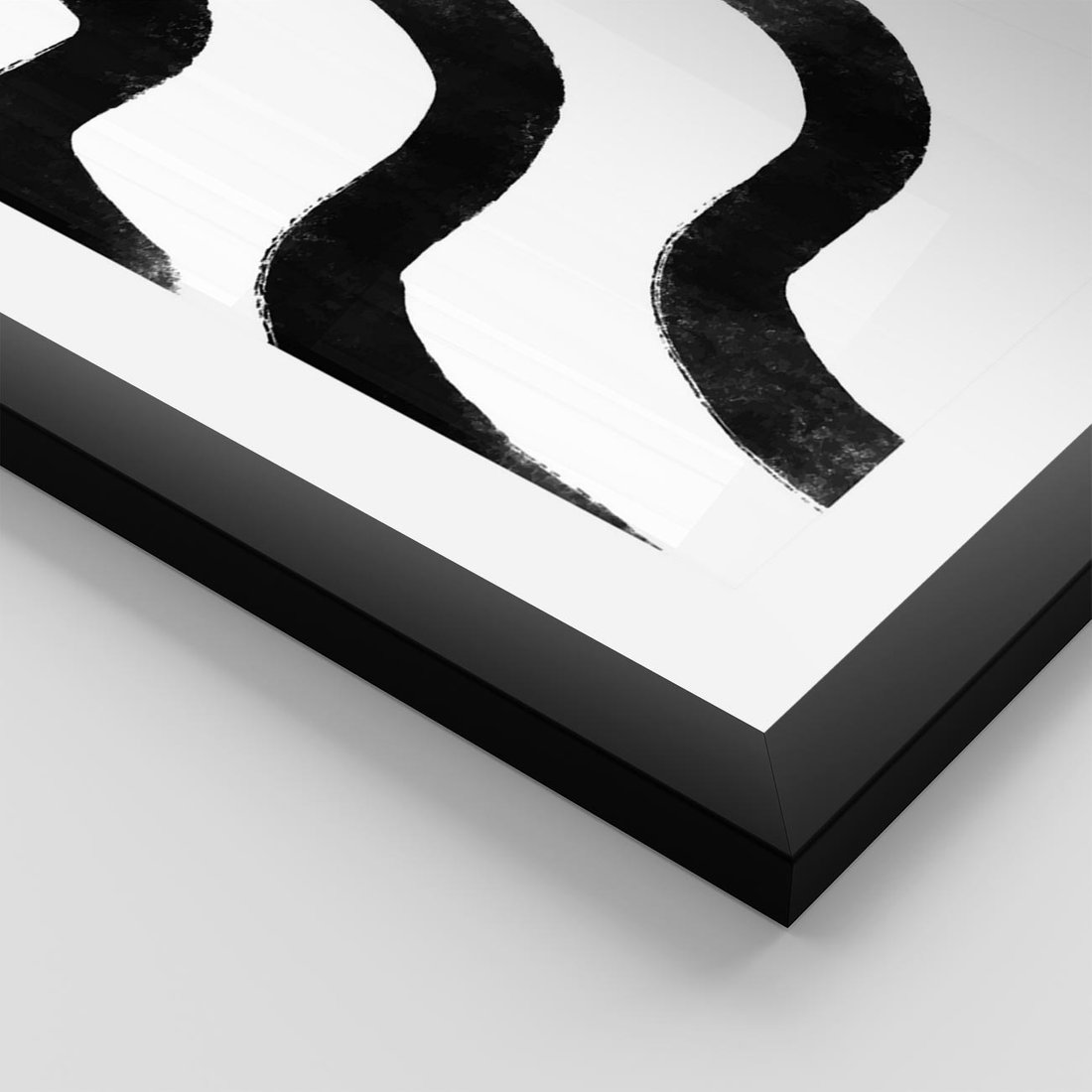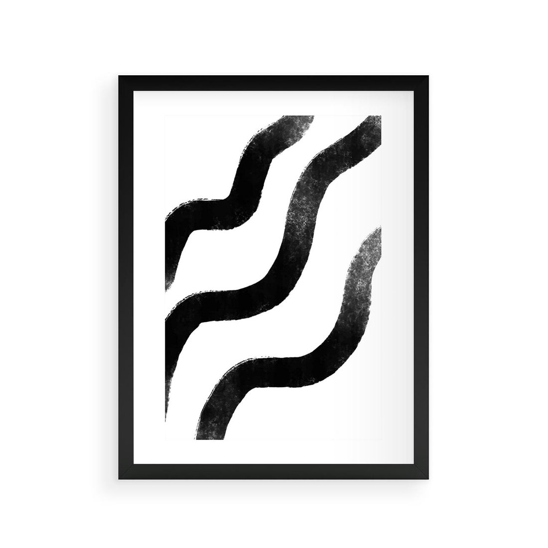Ten minimalistyczny obraz abstrakcyjny w stylu modern art charakteryzuje się czarnymi falującymi liniami, które tworzą dynamiczną i wyrazistą kompozycję. To dzieło sztuki doskonale oddaje ducha nowoczesności i minimalizmu, nadając się idealnie do współczesnych wnętrz.