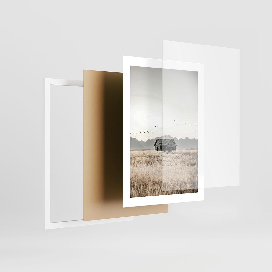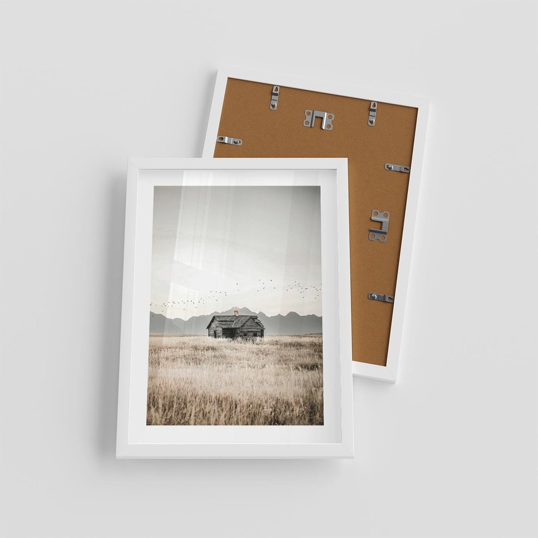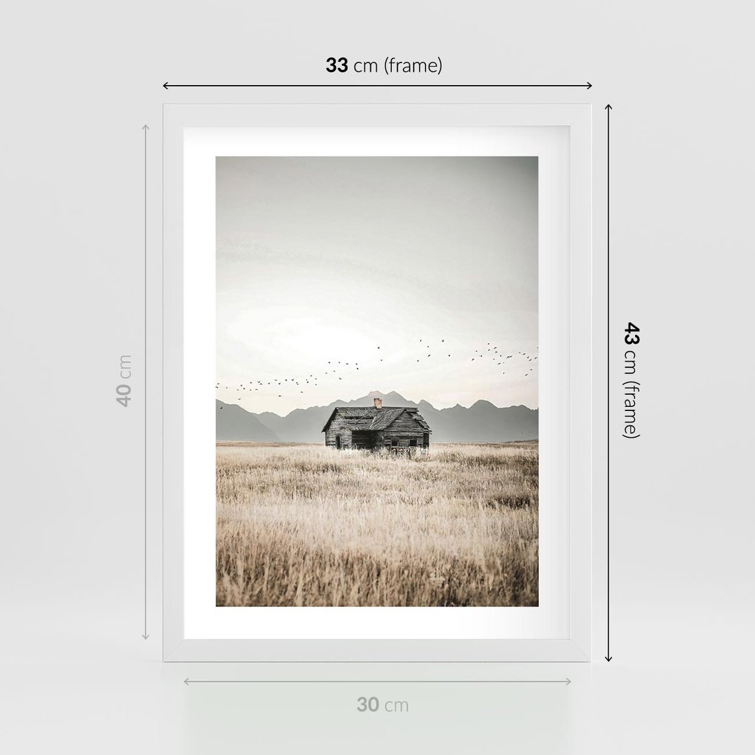 Plakat w ramie 30x40 - Wiejska Idylla - stary drewniany dom w polu suchej trawy, fotografia - rama biała