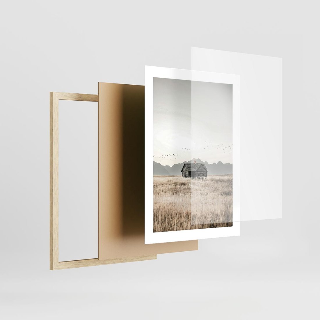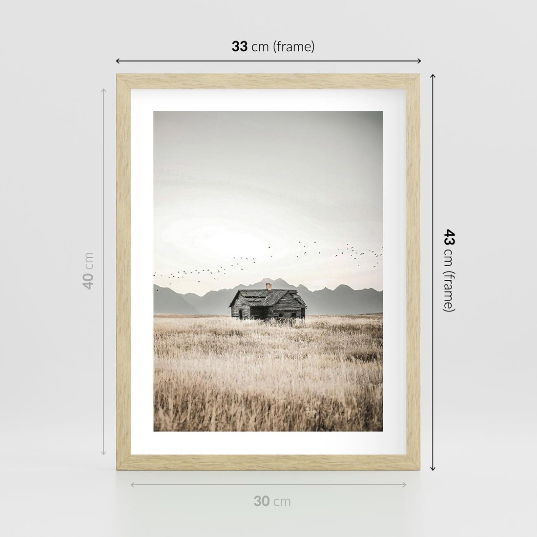 Plakat w ramie 30x40 - Wiejska Idylla - stary drewniany dom w polu suchej trawy, fotografia - rama drewno