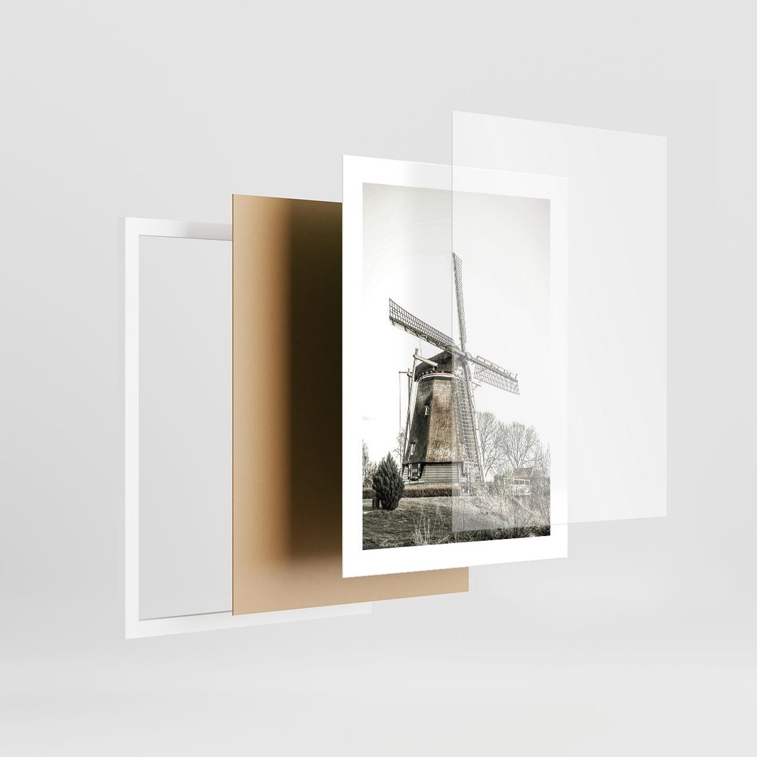 Obraz przedstawia wiejski krajobraz z wiatrakiem lub młynem w odcieniach sepii, co nadaje mu nostalgiczny i klasyczny charakter.