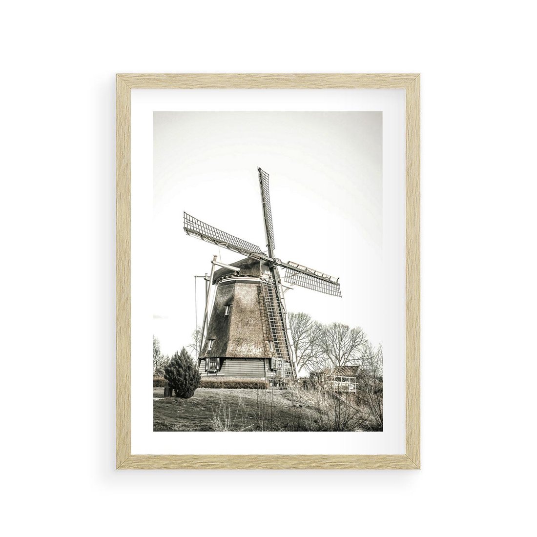 Obraz przedstawia wiejski krajobraz z wiatrakiem lub młynem w odcieniach sepii, co nadaje mu nostalgiczny i klasyczny charakter.