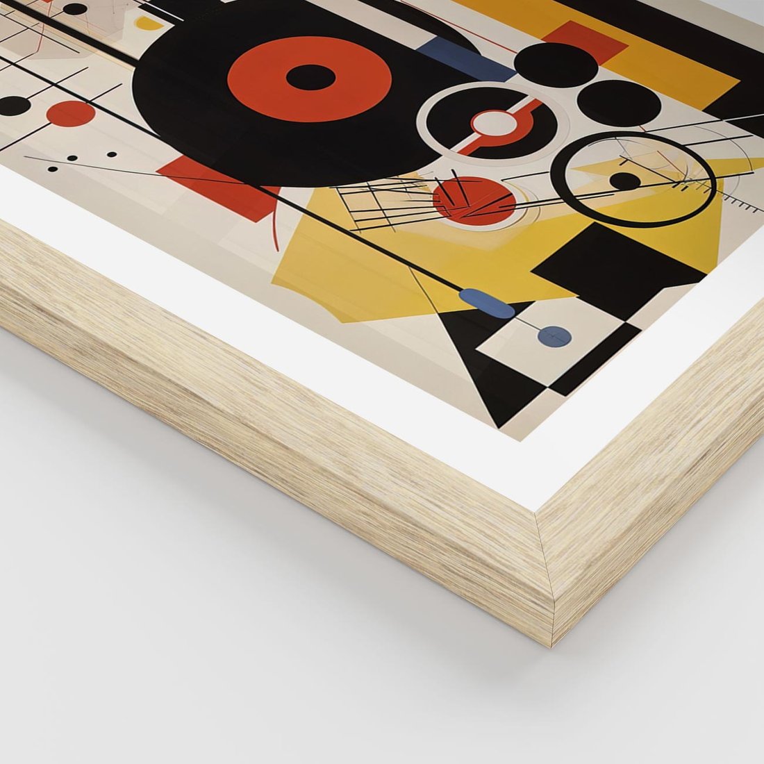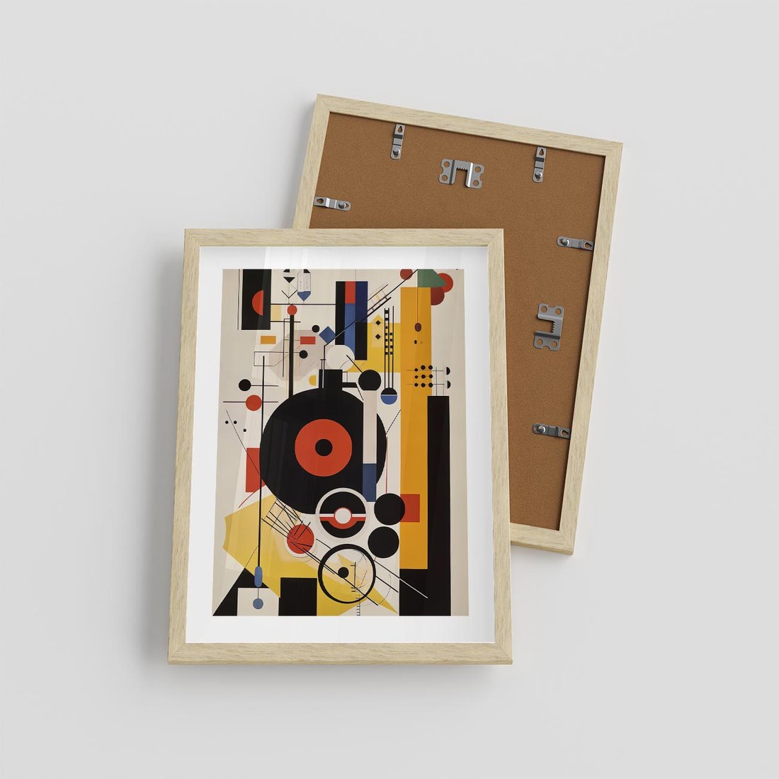 Ten modernistyczny obraz w stylu Bauhaus charakteryzuje się wyraźną geometrią, odważnymi kolorami i abstrakcyjną kompozycją. To hołd dla ducha kreatywności i eksperymentów znanego z ruchu Bauhaus.