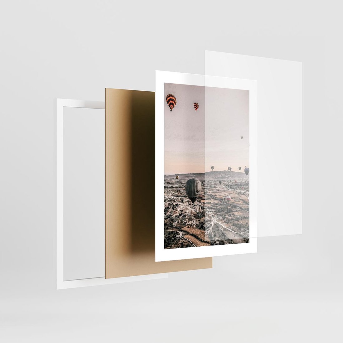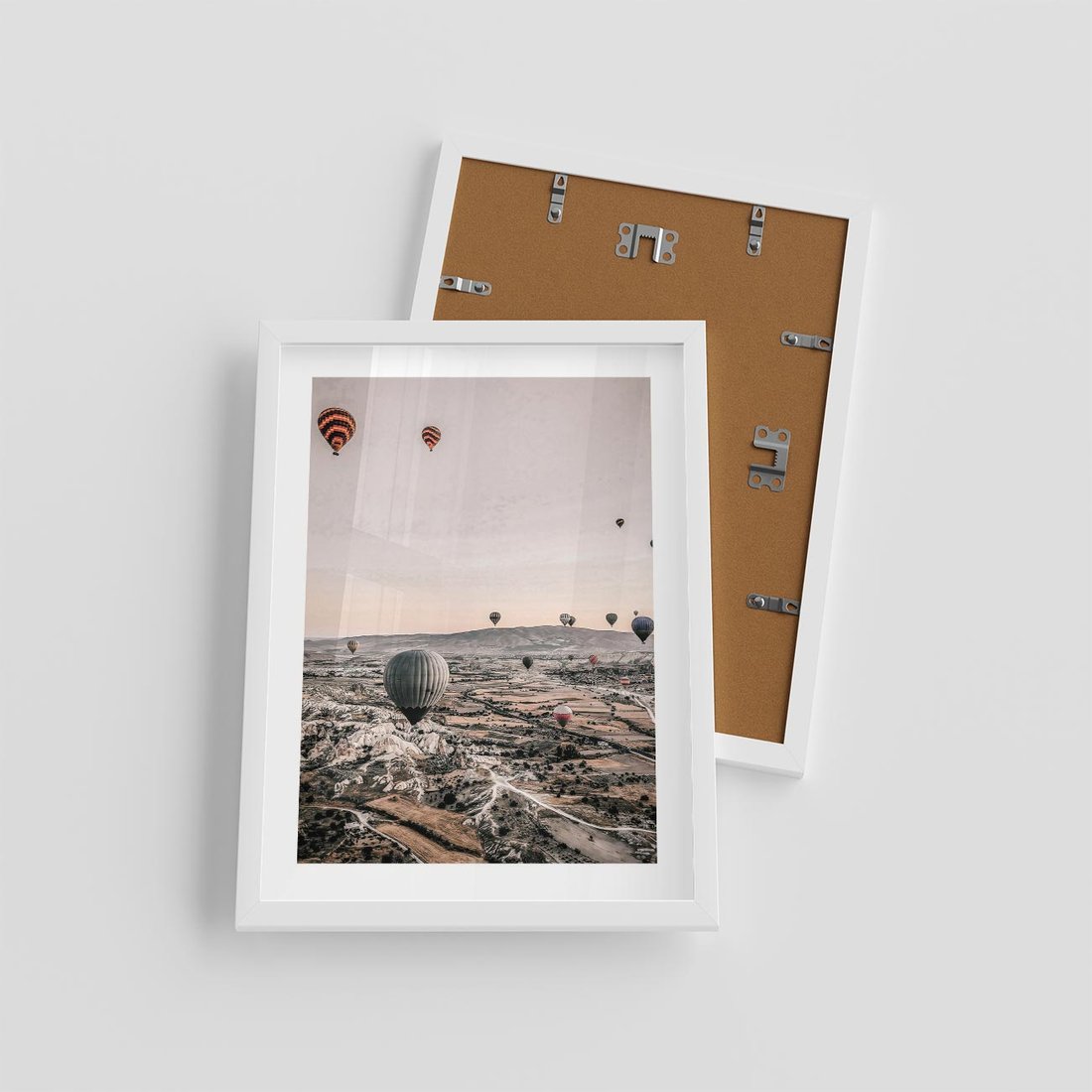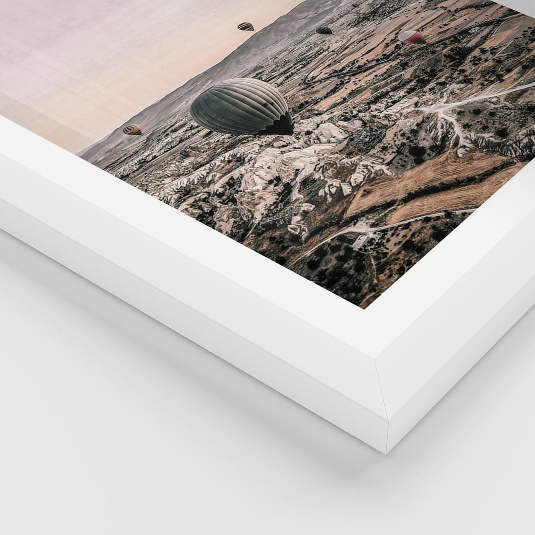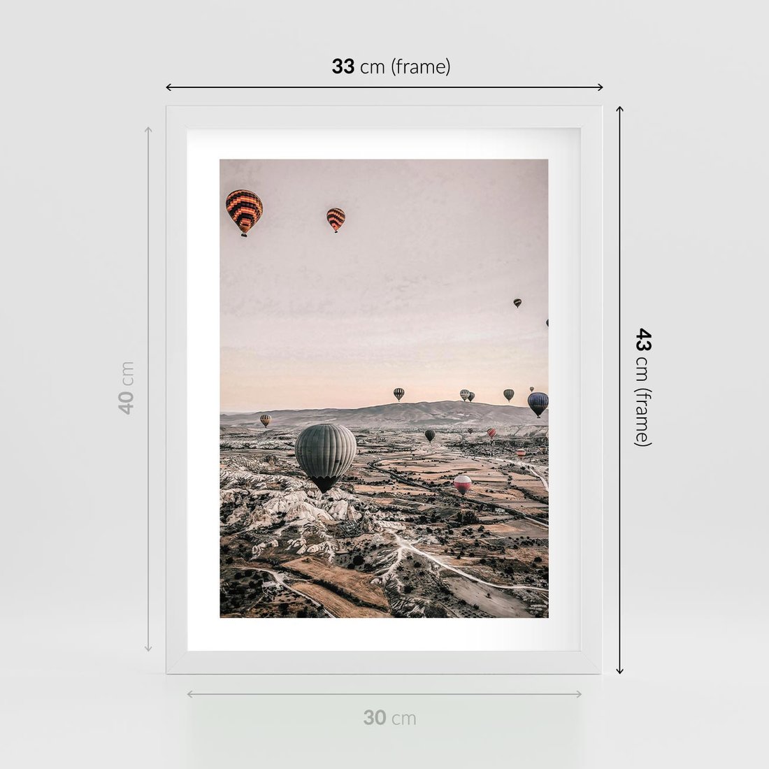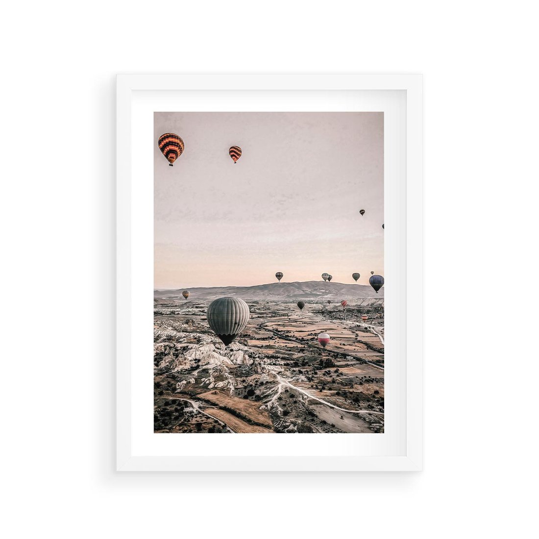 Plakat w ramie 30x40 - Wolność w Powietrzu - balony latające nas pustynnym krajbrazem, balony do latania - rama biała