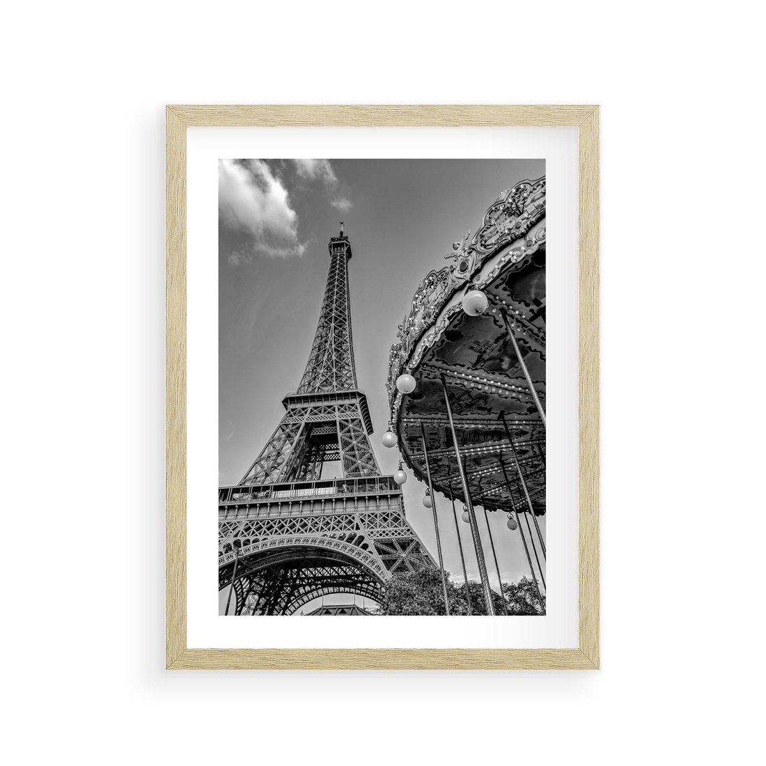 To czarno-białe zdjęcie przedstawia Wieżę Eiffla w Paryżu w towarzystwie urokliwej karuzeli. To ikoniczna scena z francuskiej stolicy, która łączy w sobie zarówno nowoczesność symbolizowaną przez wieżę, jak i klasyczną, nostalgiczną atmosferę karuzeli. To zdjęcie przenosi nas do magicznego świata Paryża, gdzie historia i nowoczesność spotykają się w niezwykły sposób. Jest to doskonała dekoracja dla tych, którzy pragną poczuć magię tego pięknego miasta.