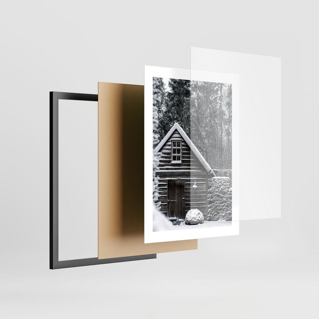 Plakat w ramie 30x40 - Zaklęta Zima - domek w lesie, śnieg - rama czarna