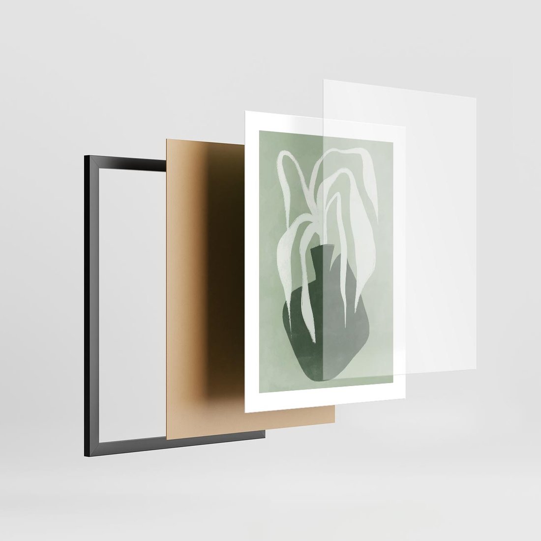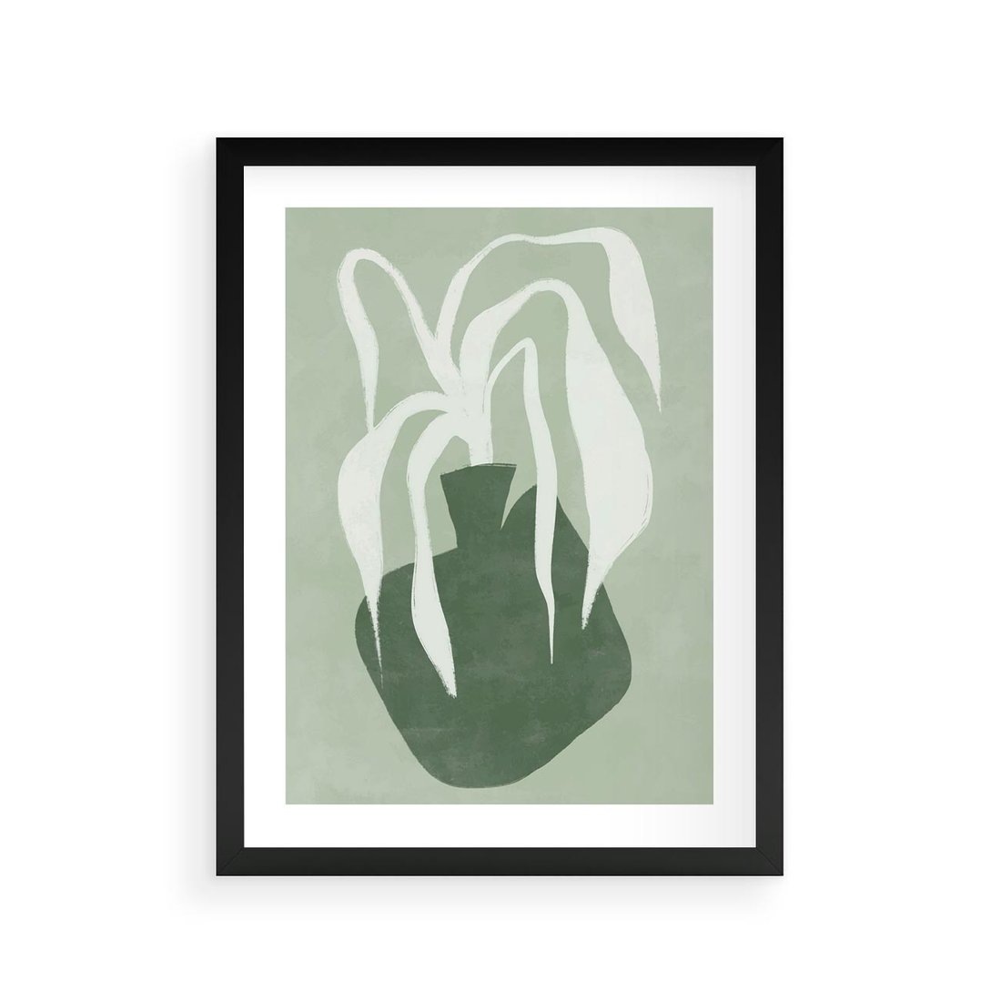 Zielona abstrakcja o zgaszonych odcieniach zieleni to minimalistyczny plakat idealny do wnętrz w stylu skandynawskim. Kwiat w doniczce dodaje subtelności i harmonii, tworząc spokojną i przyjemną atmosferę.