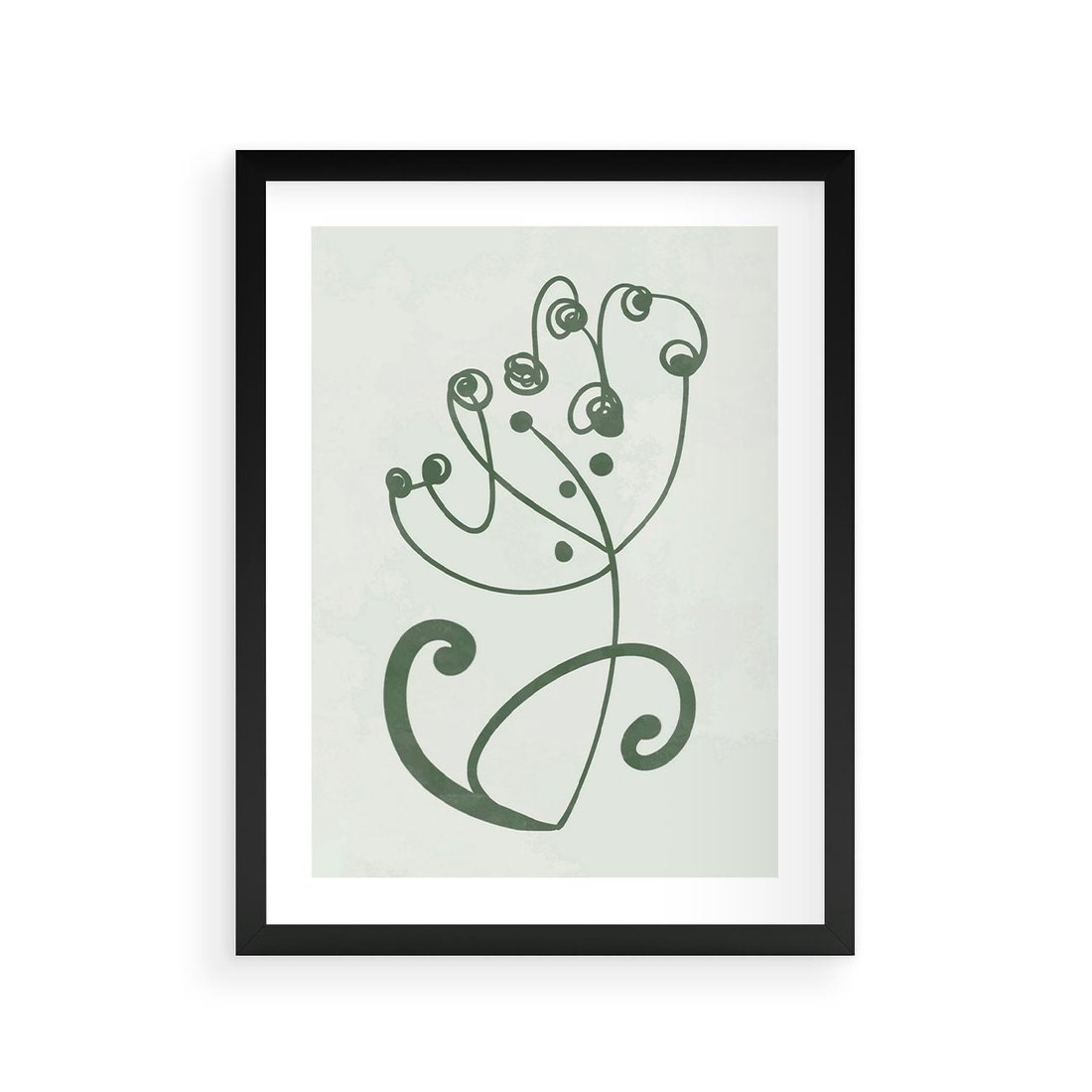 Abstrakcyjna sztuka w odcieniach zielonego. Minimalistyczne kompozycje przypominające roślinne formy tworzą harmonijny obraz natury i spokoju.