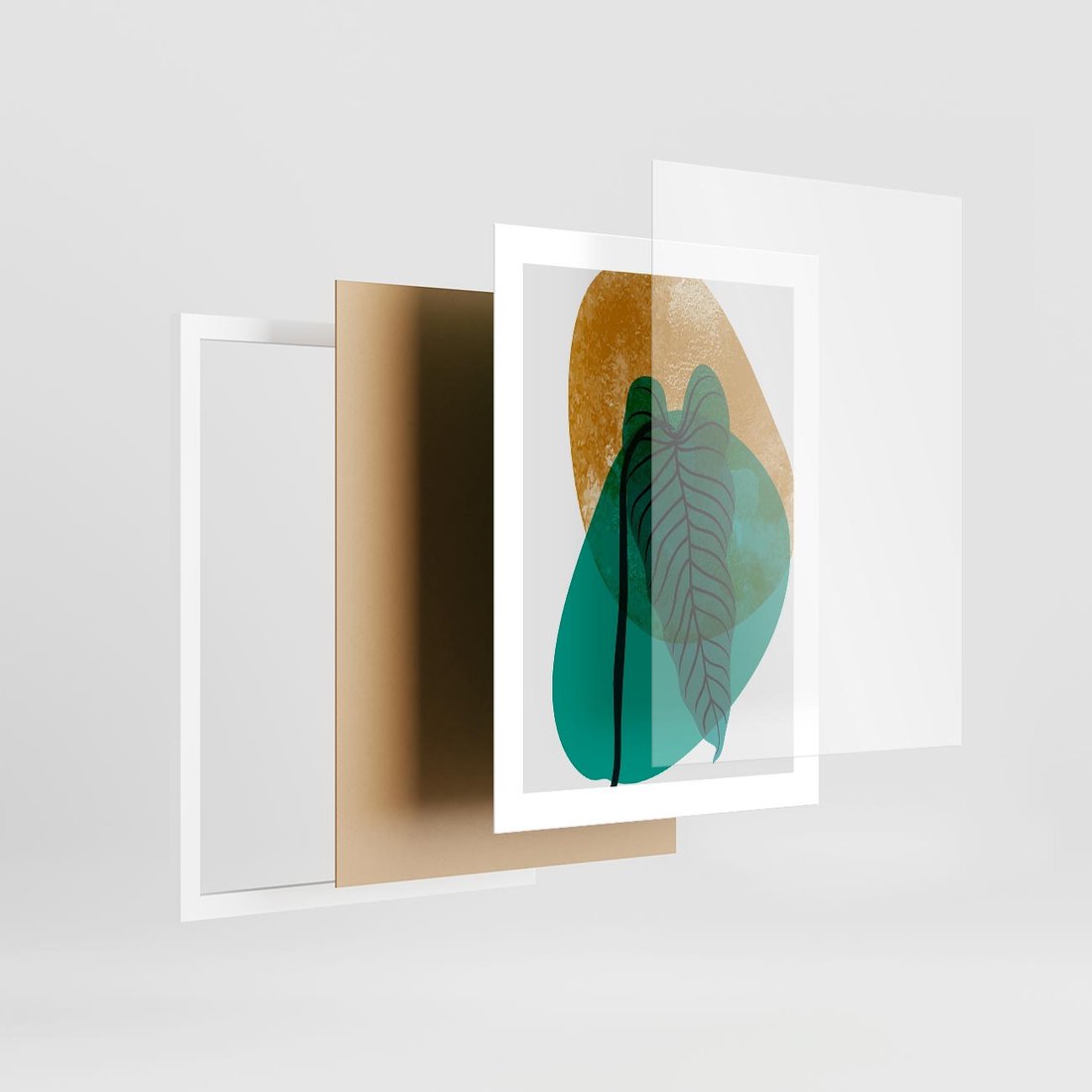 Obraz przedstawia grafikę z zielonym liściem i złotą plamą, tworząc elegancką i harmonijną kompozycję.