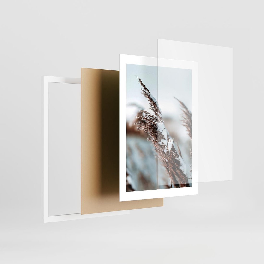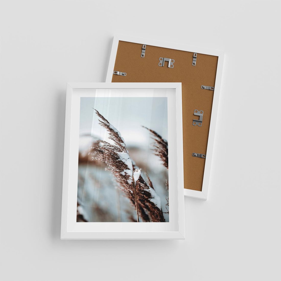 Plakat w ramie 30x40 - Zima na Suchych Trawach - suche trawy, śnieg wysokich na trawach - rama biała