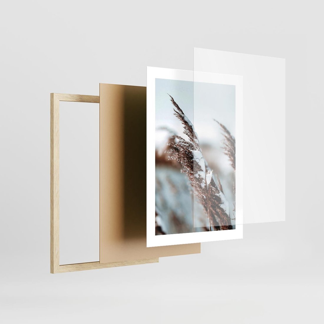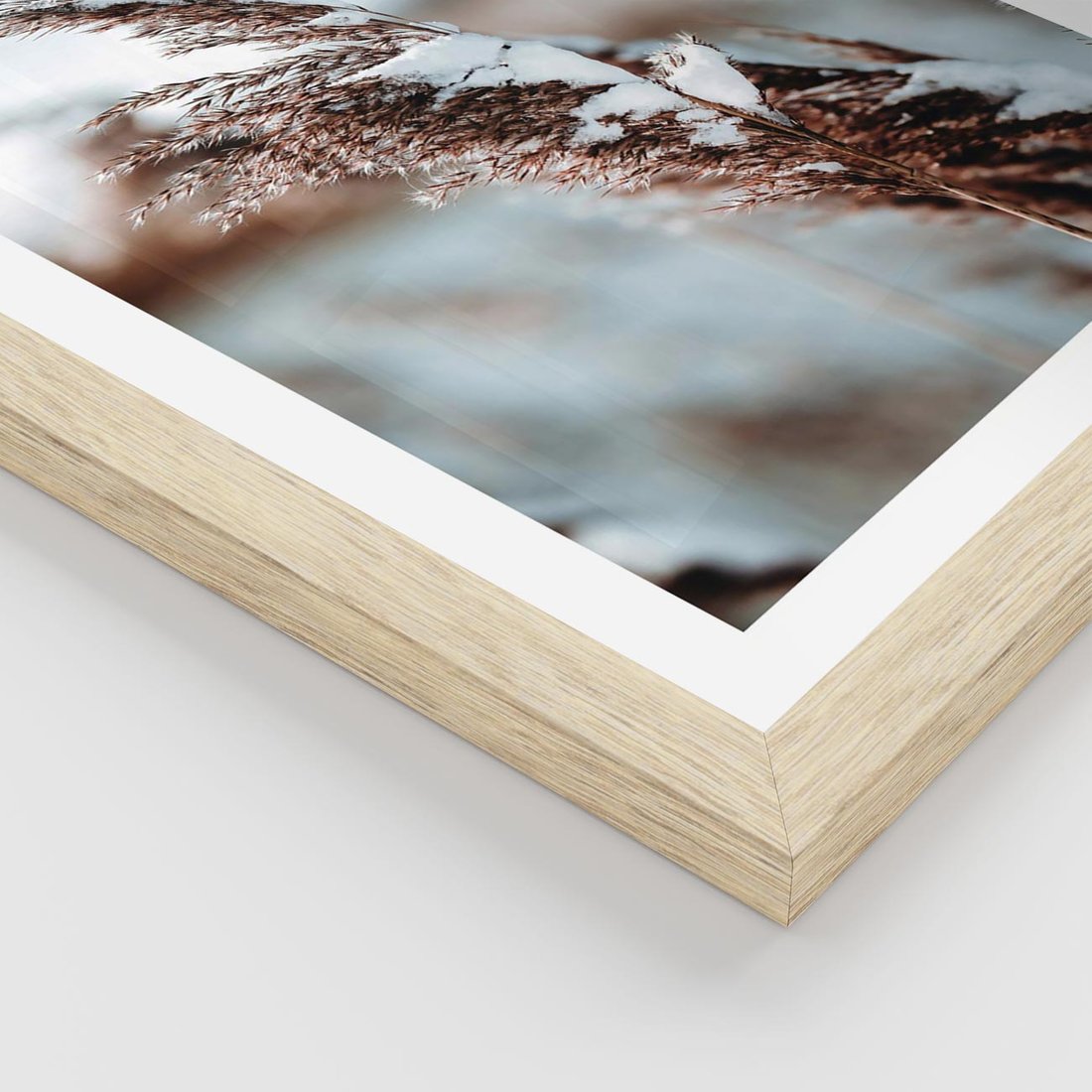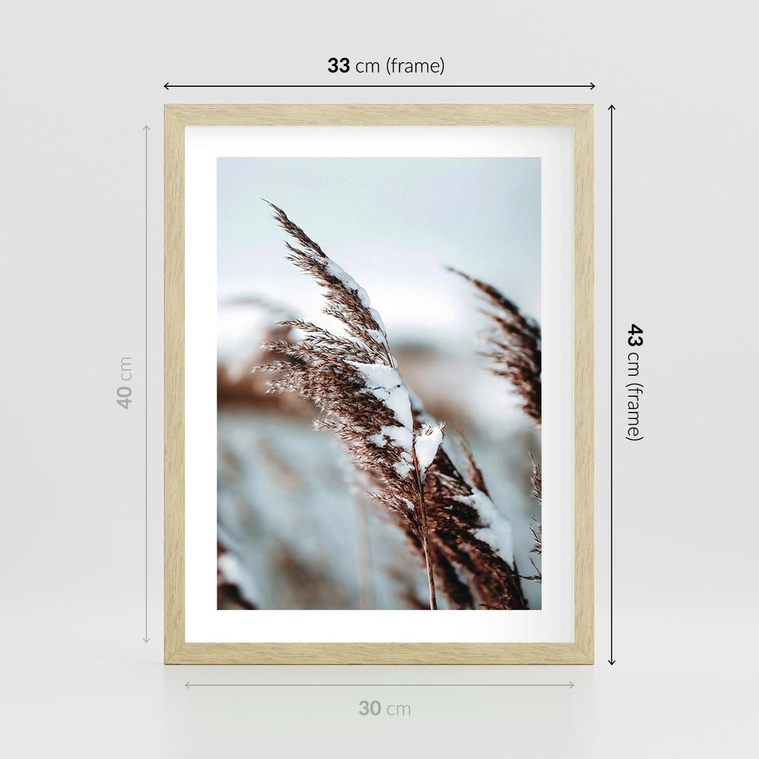 Plakat w ramie 30x40 - Zima na Suchych Trawach - suche trawy, śnieg wysokich na trawach - rama drewno