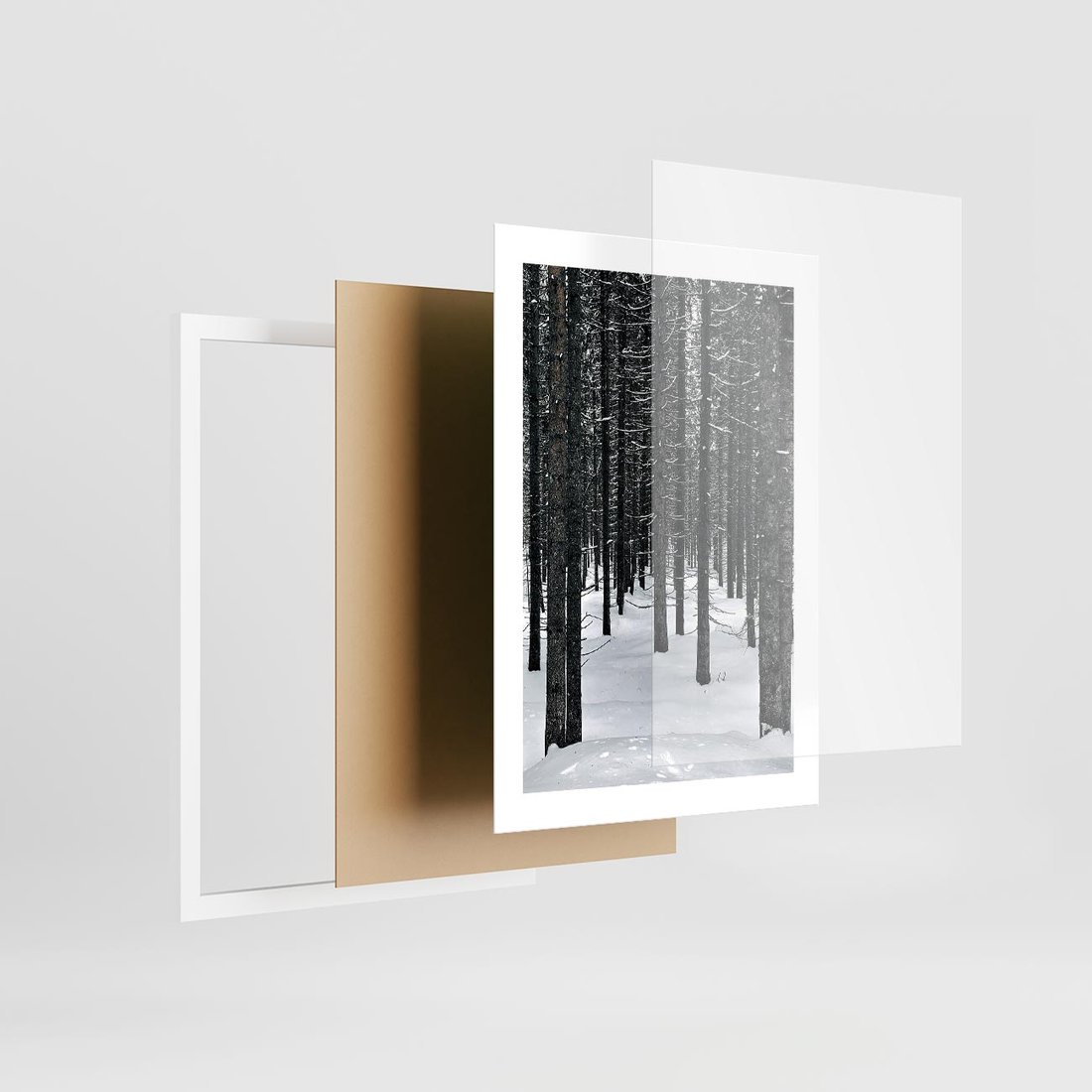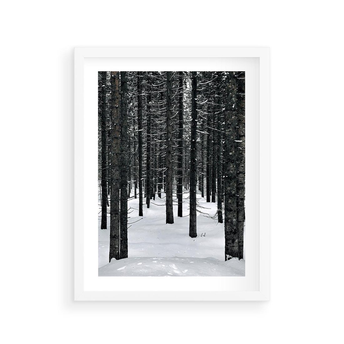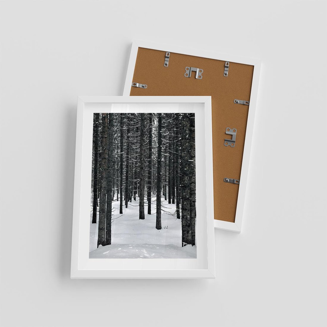 Plakat w ramie 30x40 - Zimowe Drzewa: Śnieg na Pniach - drzew w zimi, pnie drzew - rama biała