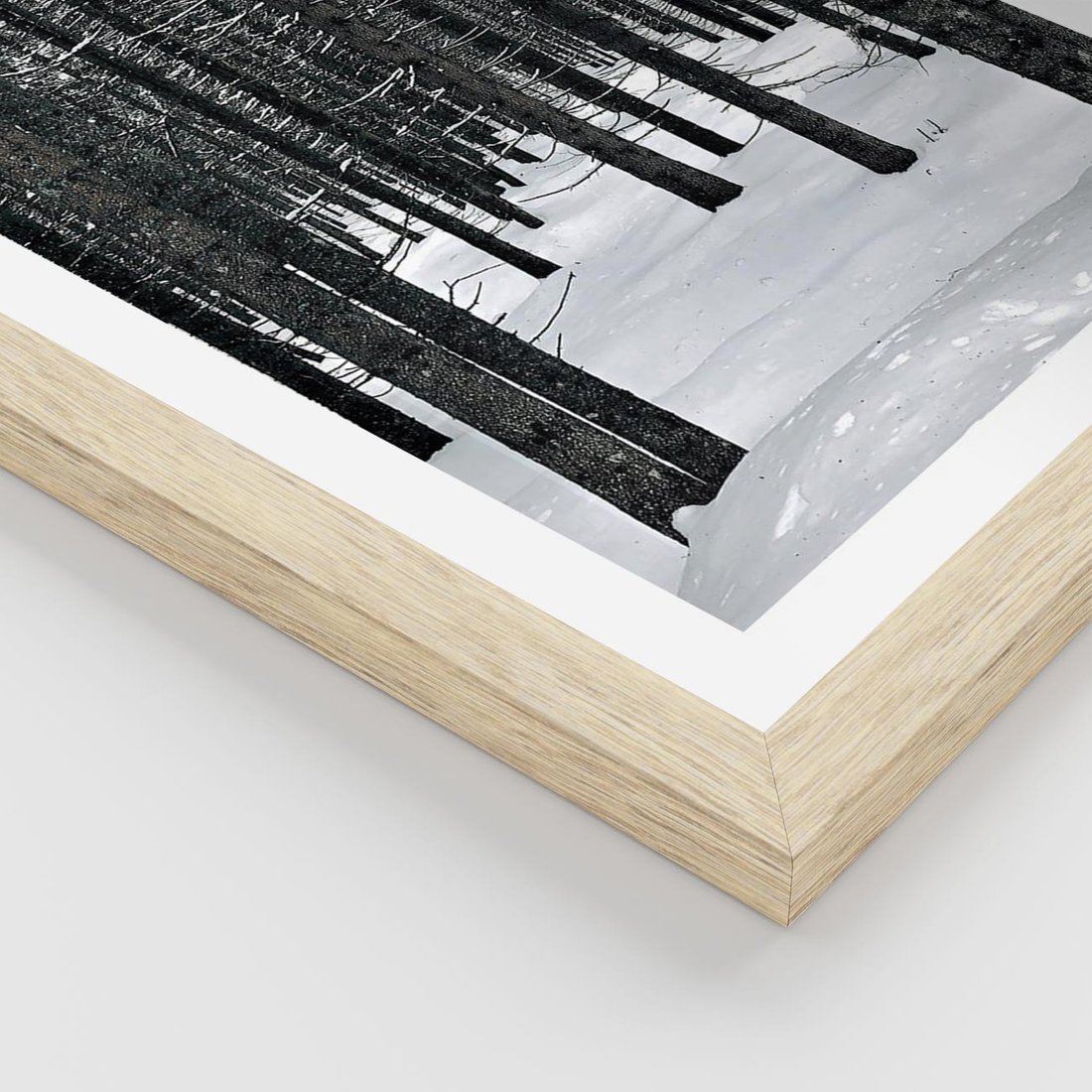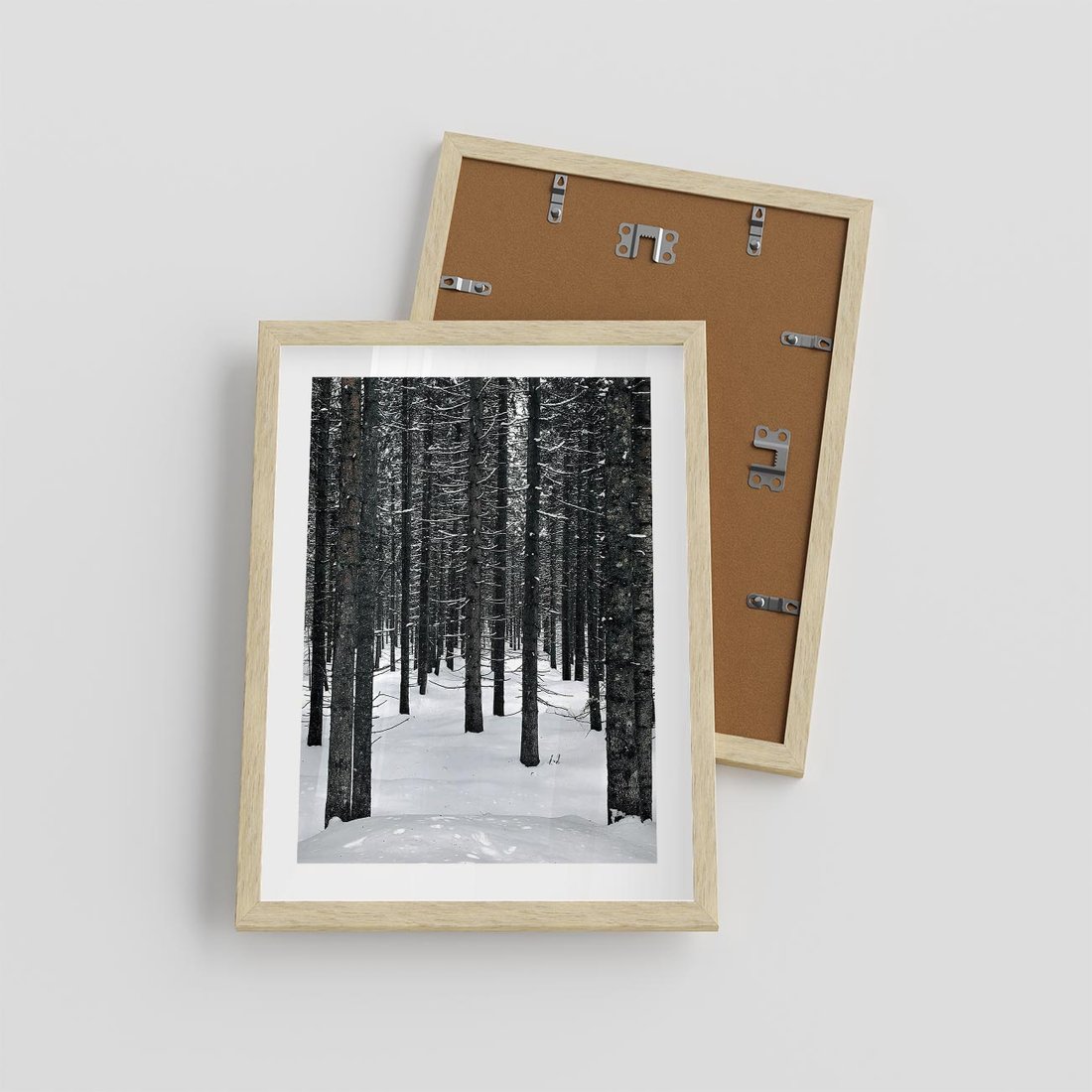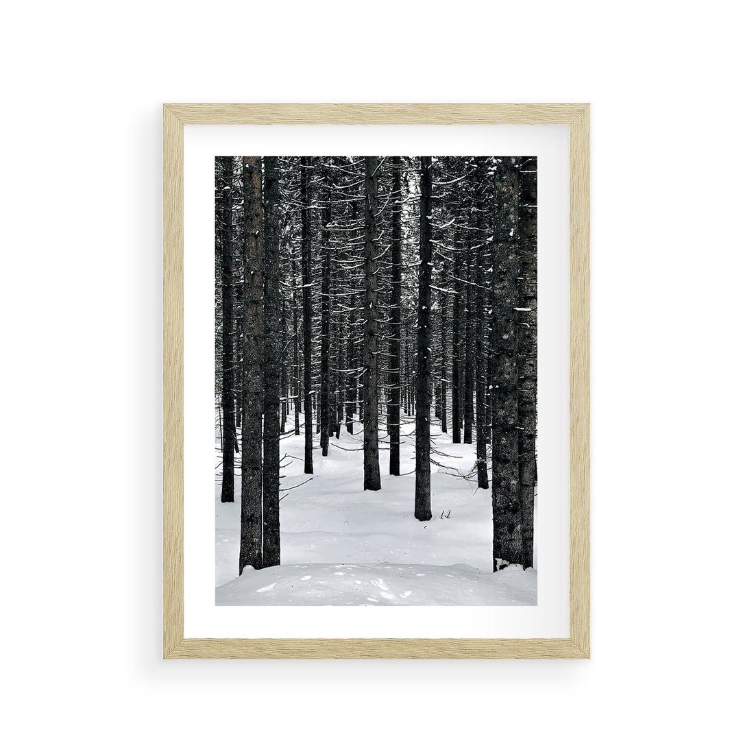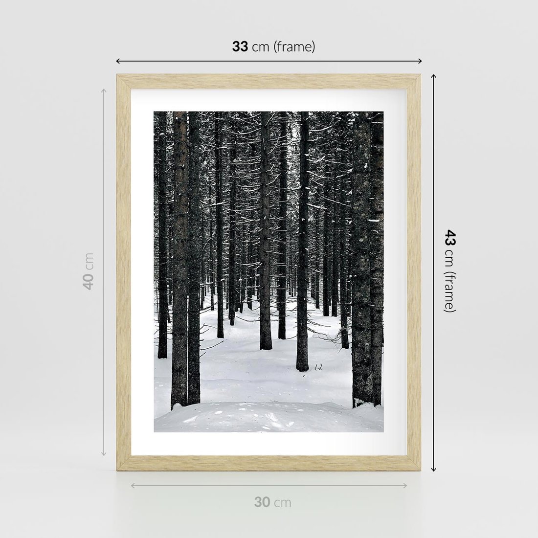 Plakat w ramie 30x40 - Zimowe Drzewa: Śnieg na Pniach - drzew w zimi, pnie drzew - rama drewno