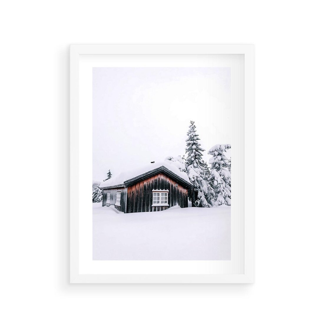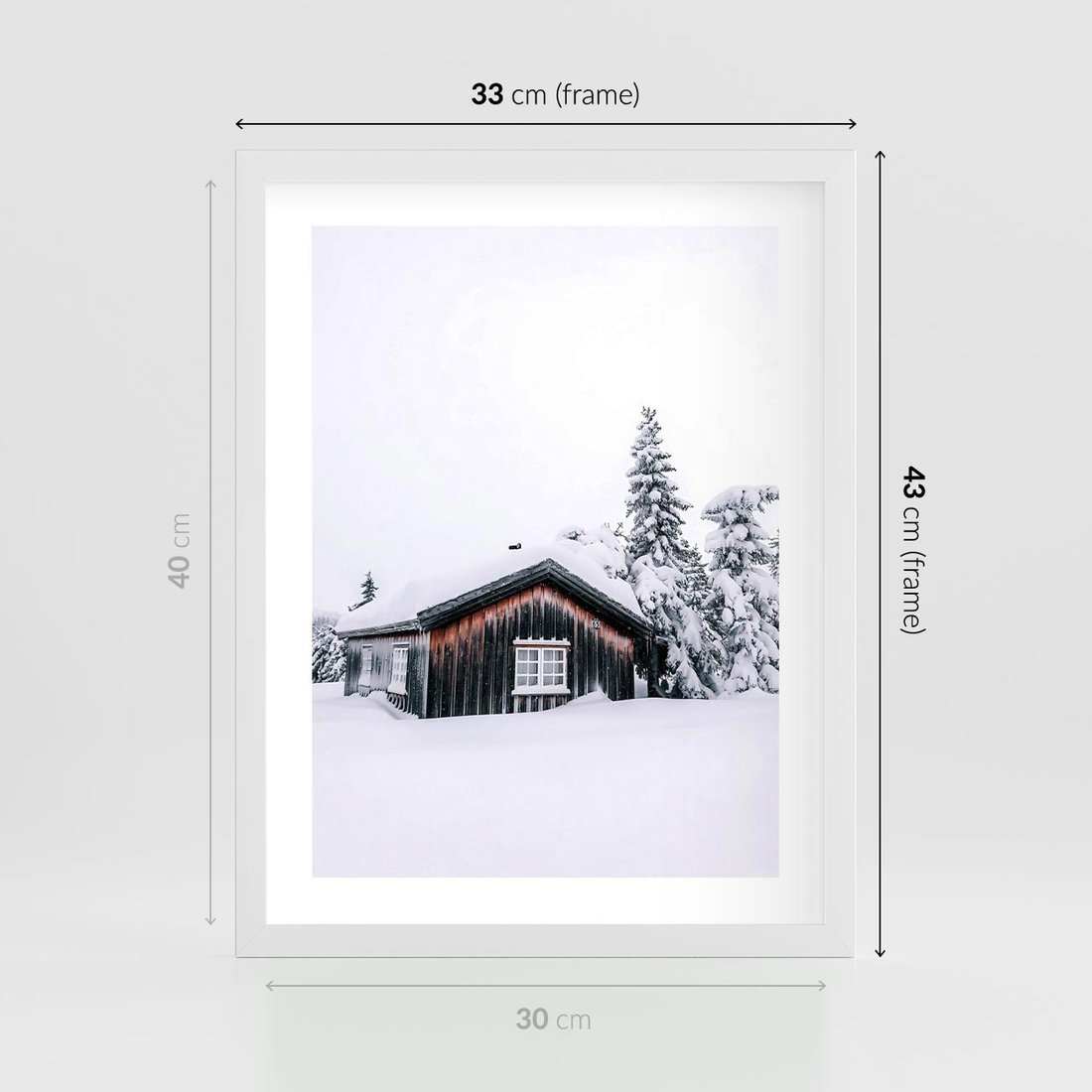 Plakat w ramie 30x40 - Zimowy Azyl: Domek w Górach - domek w górach, śnieg - rama biała