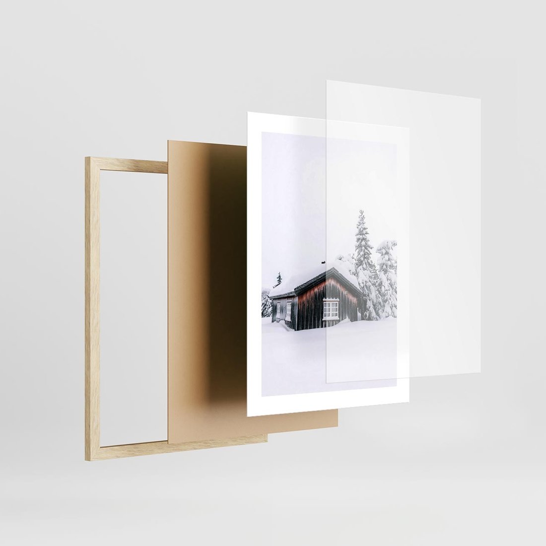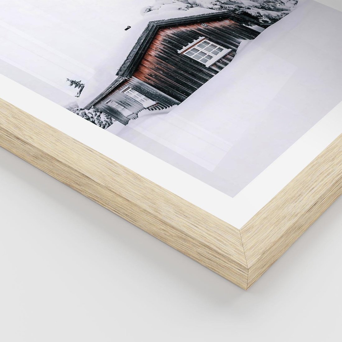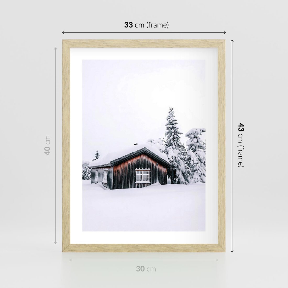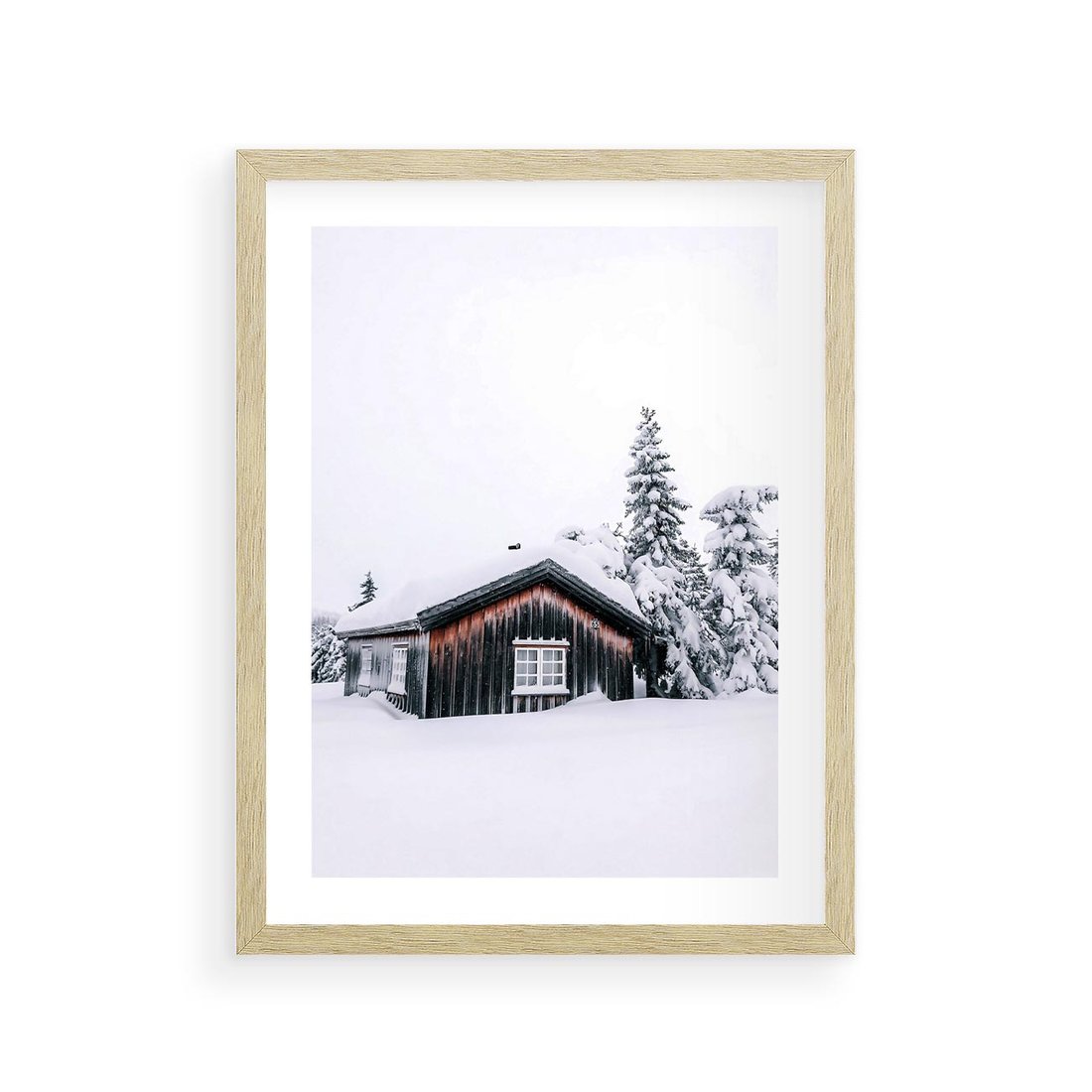 Plakat w ramie 30x40 - Zimowy Azyl: Domek w Górach - domek w górach, śnieg - rama drewno