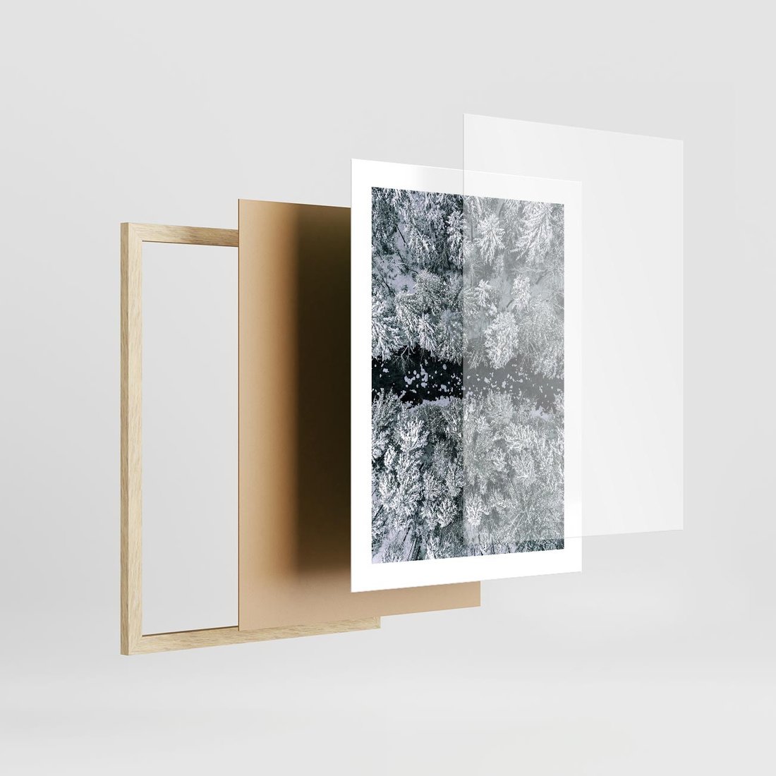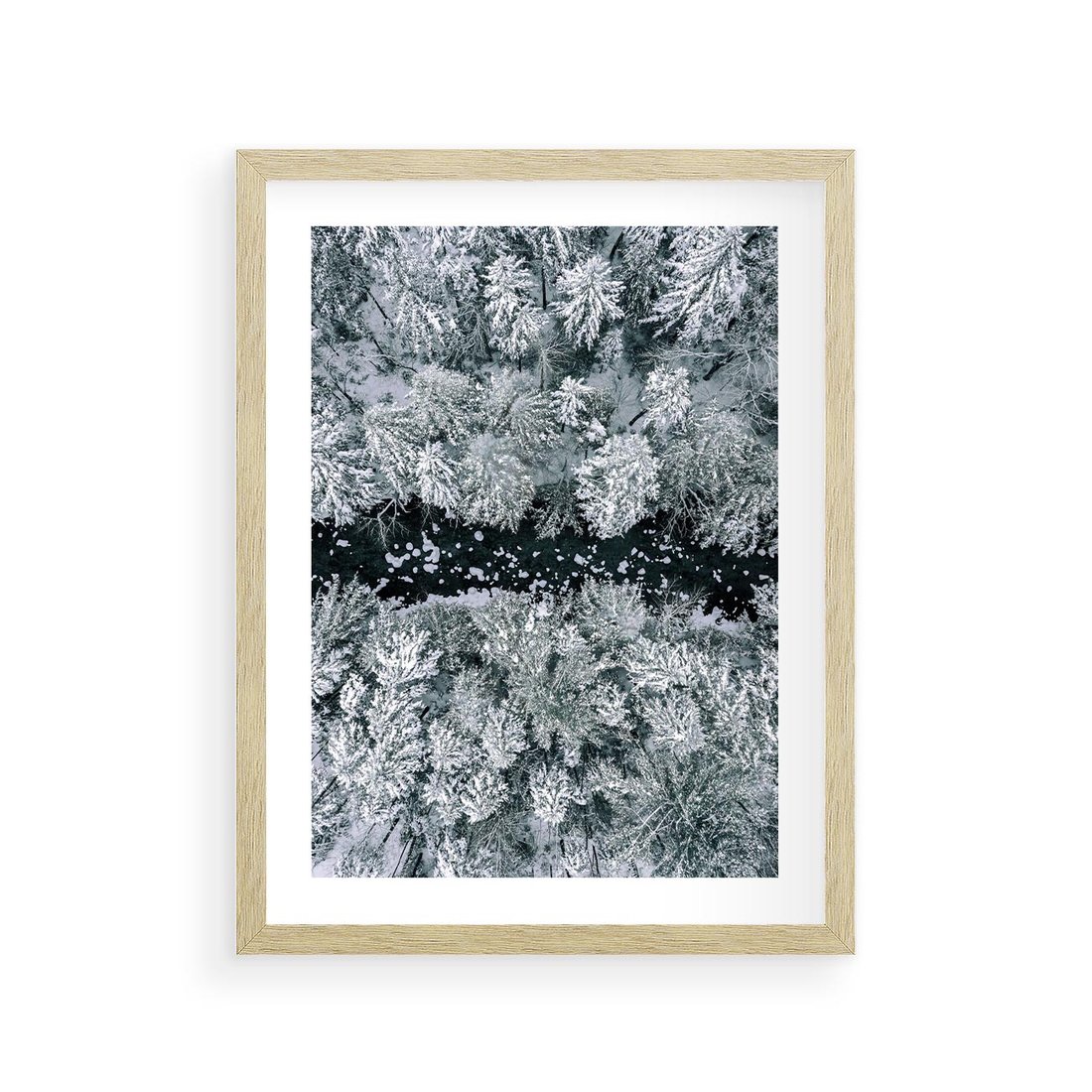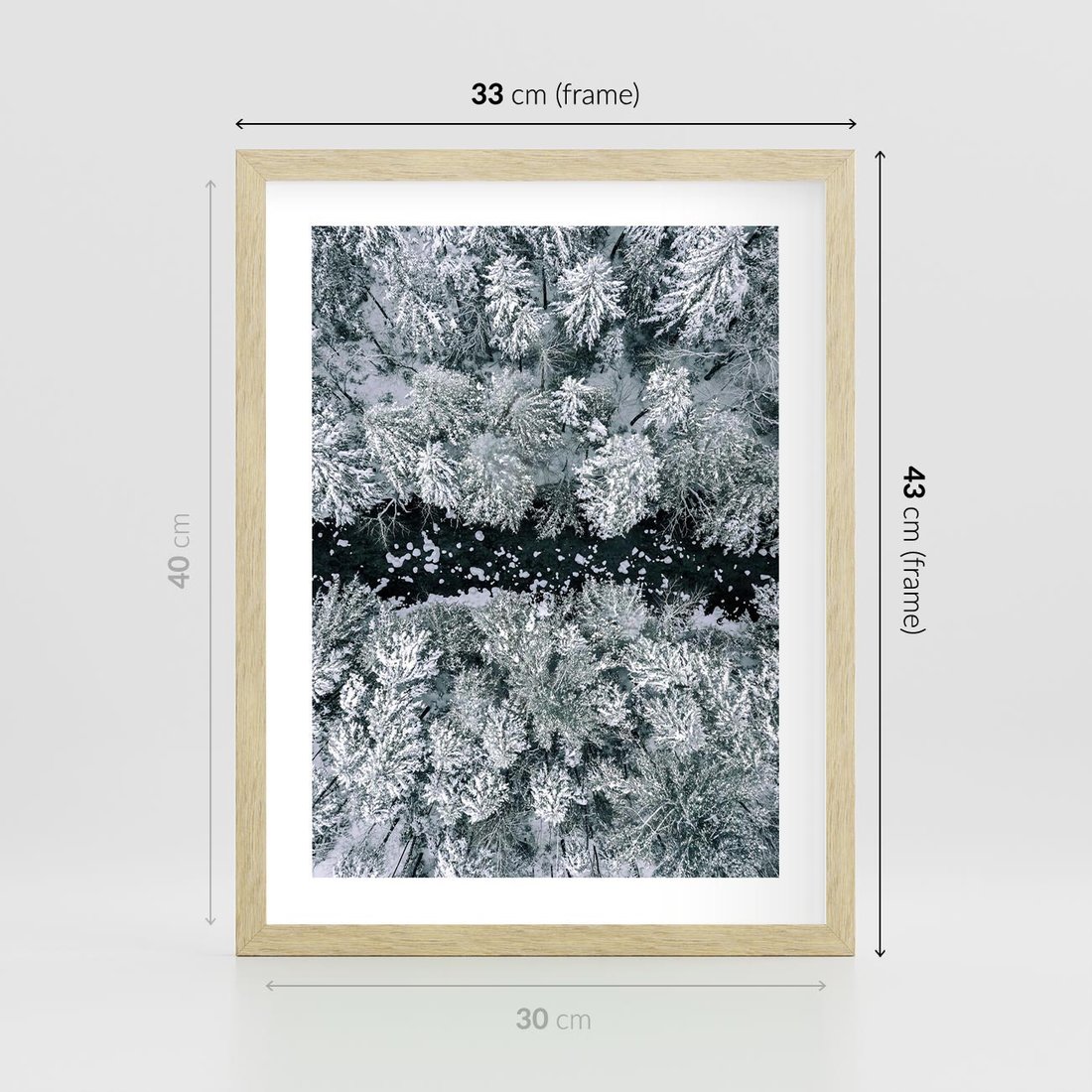 Plakat w ramie 30x40 - Zimowy Krajobraz z Góry - zdjęcie z góry, zaśnieżony las i zamarznięty strumyk - rama drewno
