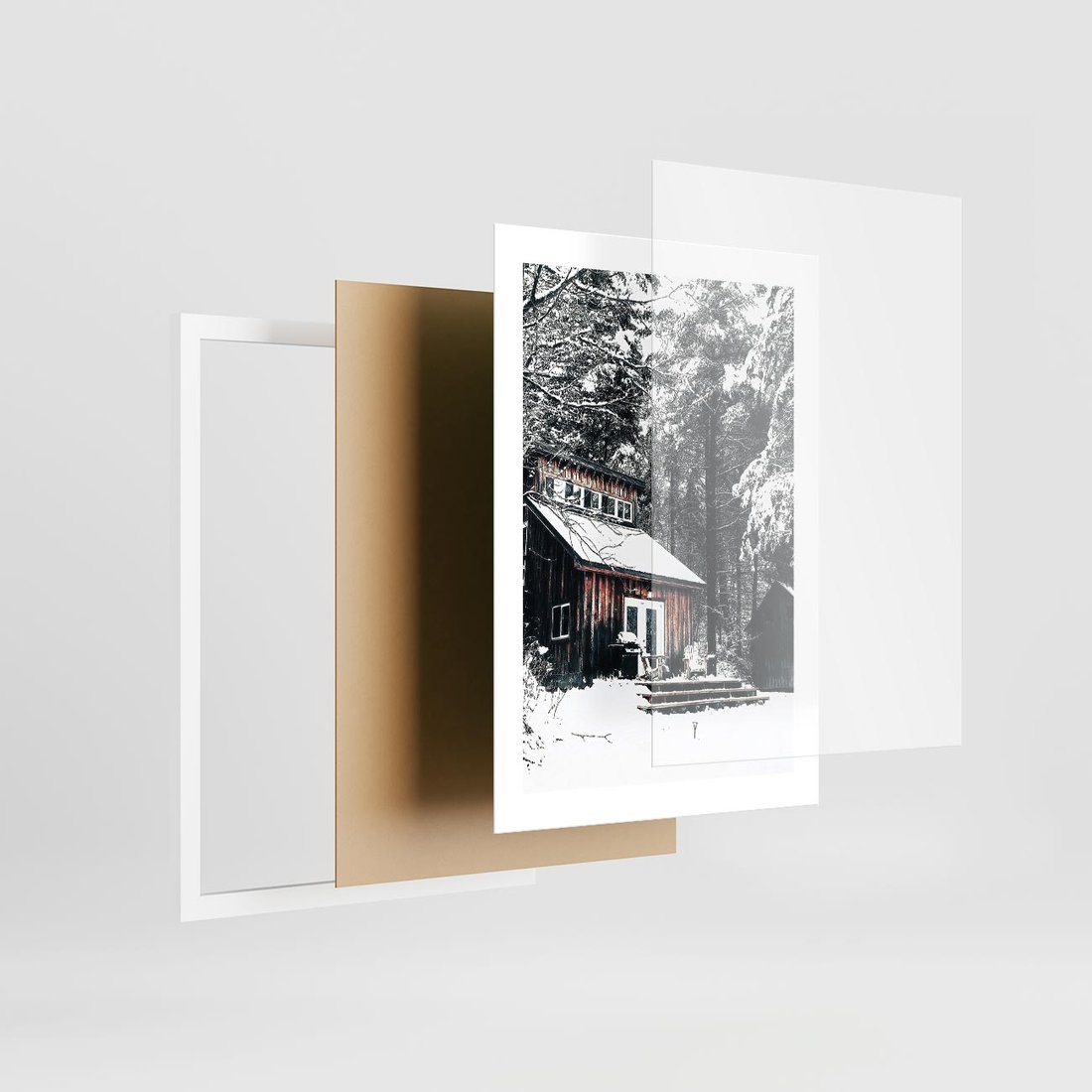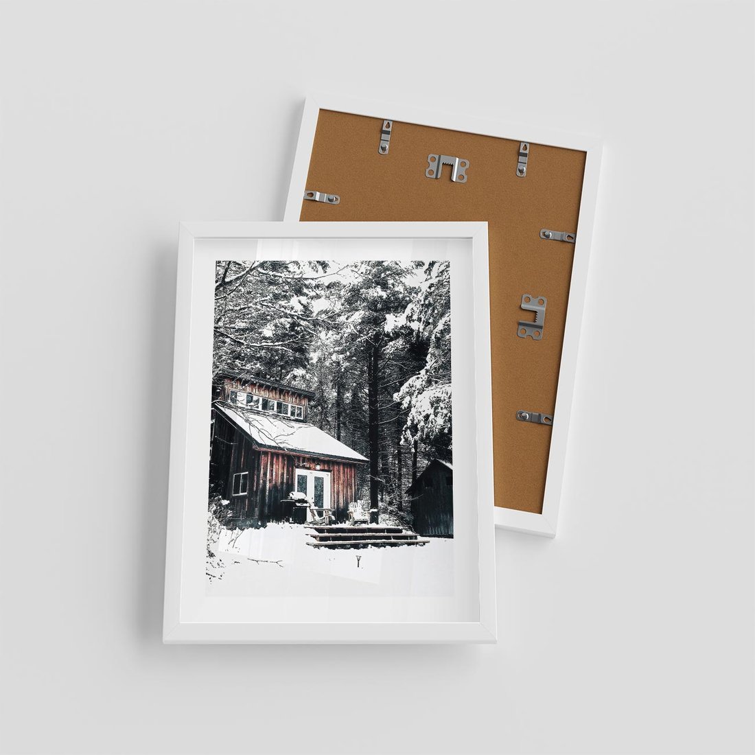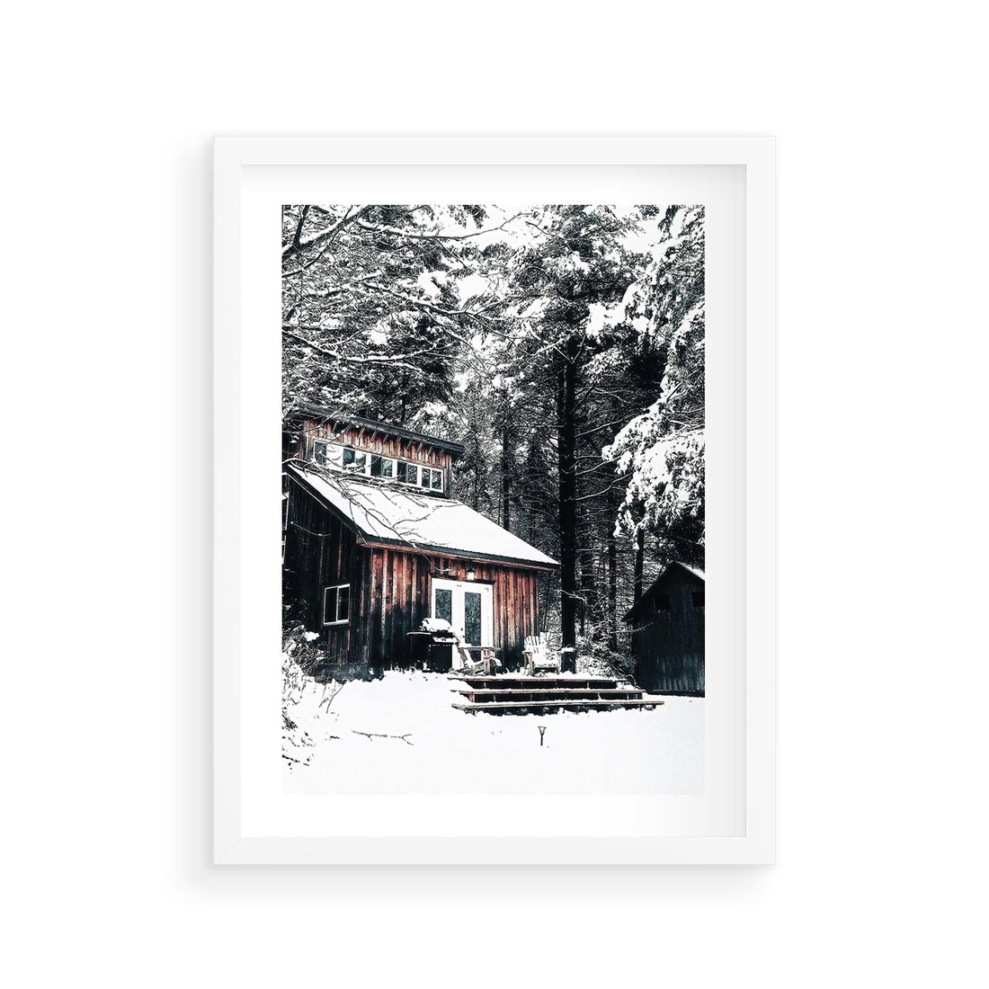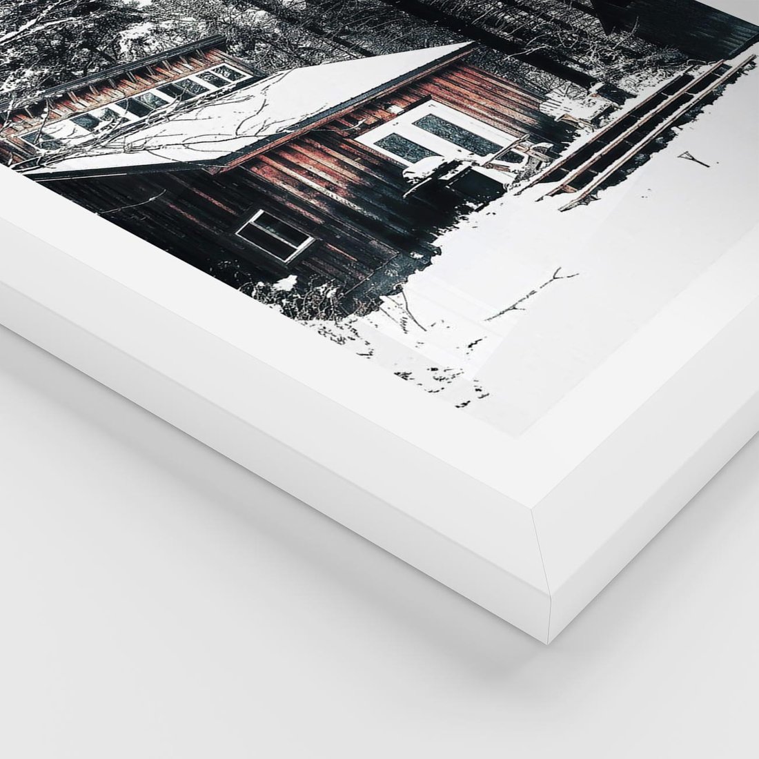Plakat w ramie 30x40 - Zimowy Urok Drewnianego Domku - zima, drewniany domek - rama biała