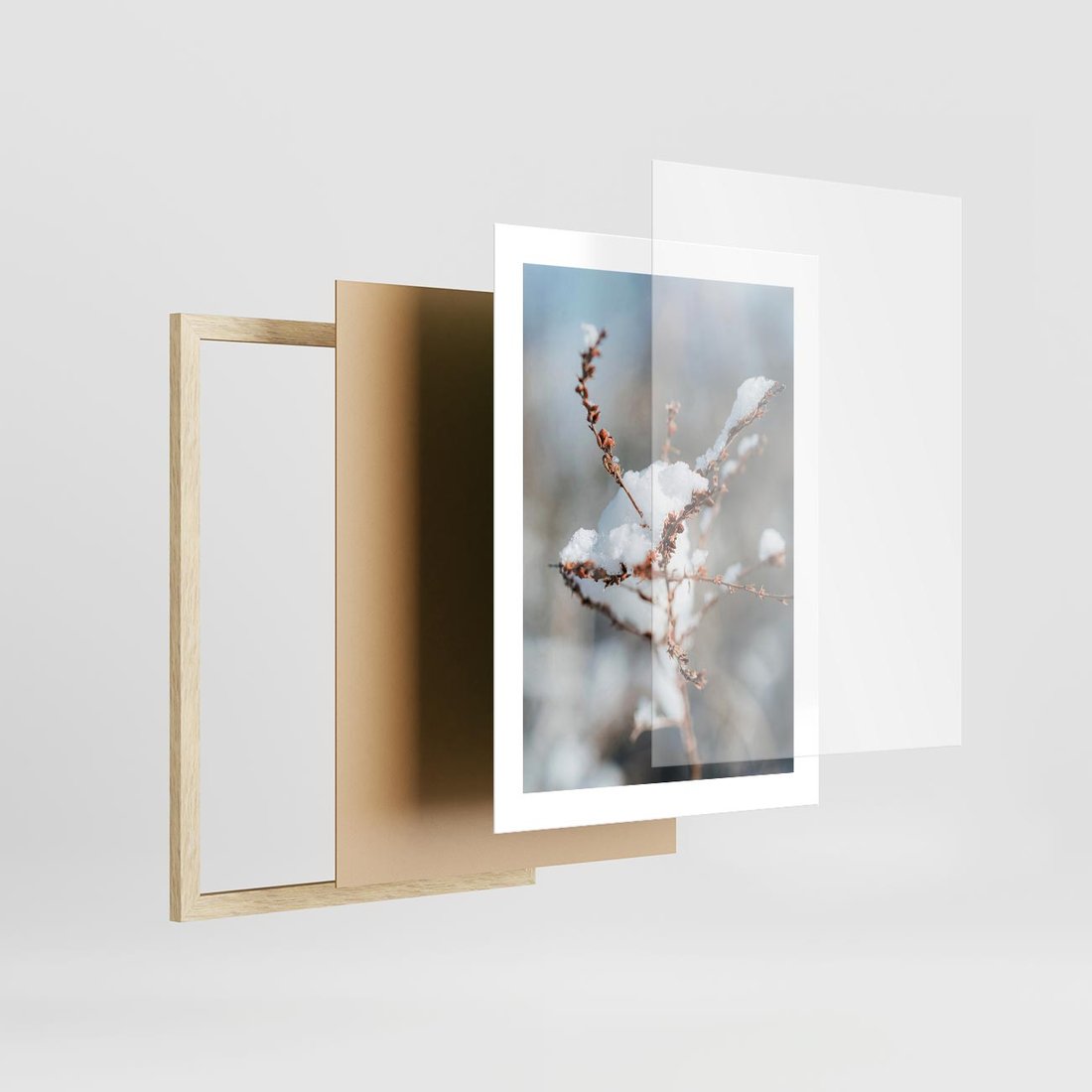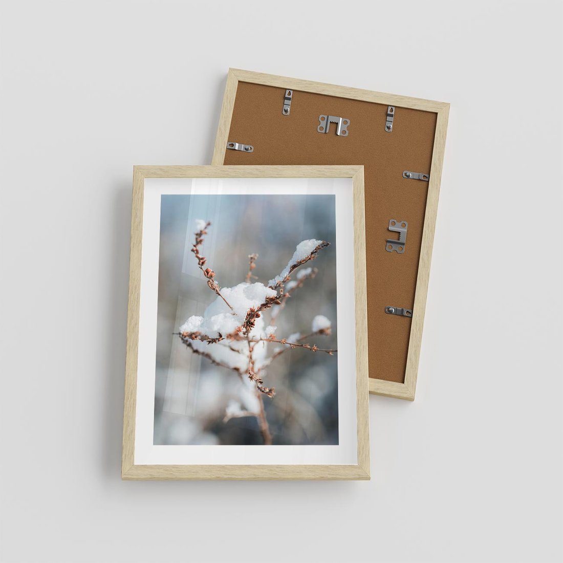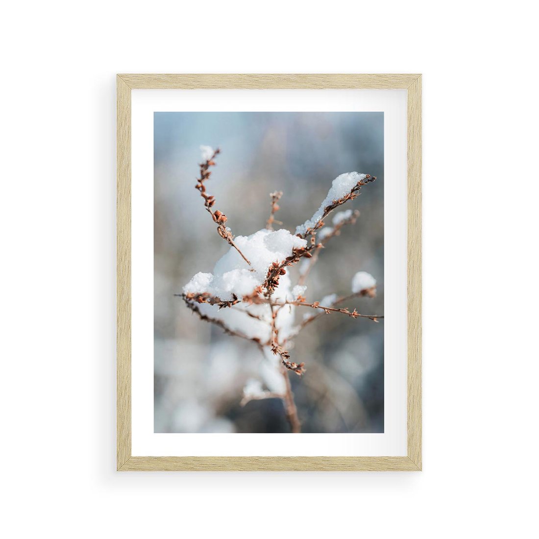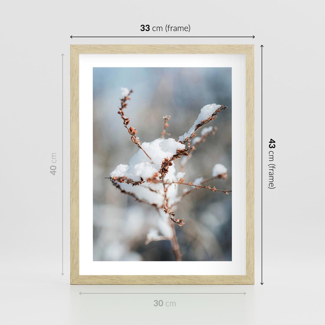 Plakat w ramie 30x40 - Zimowy Urok Natury - gałązki pod śniegiem, natura - rama drewno