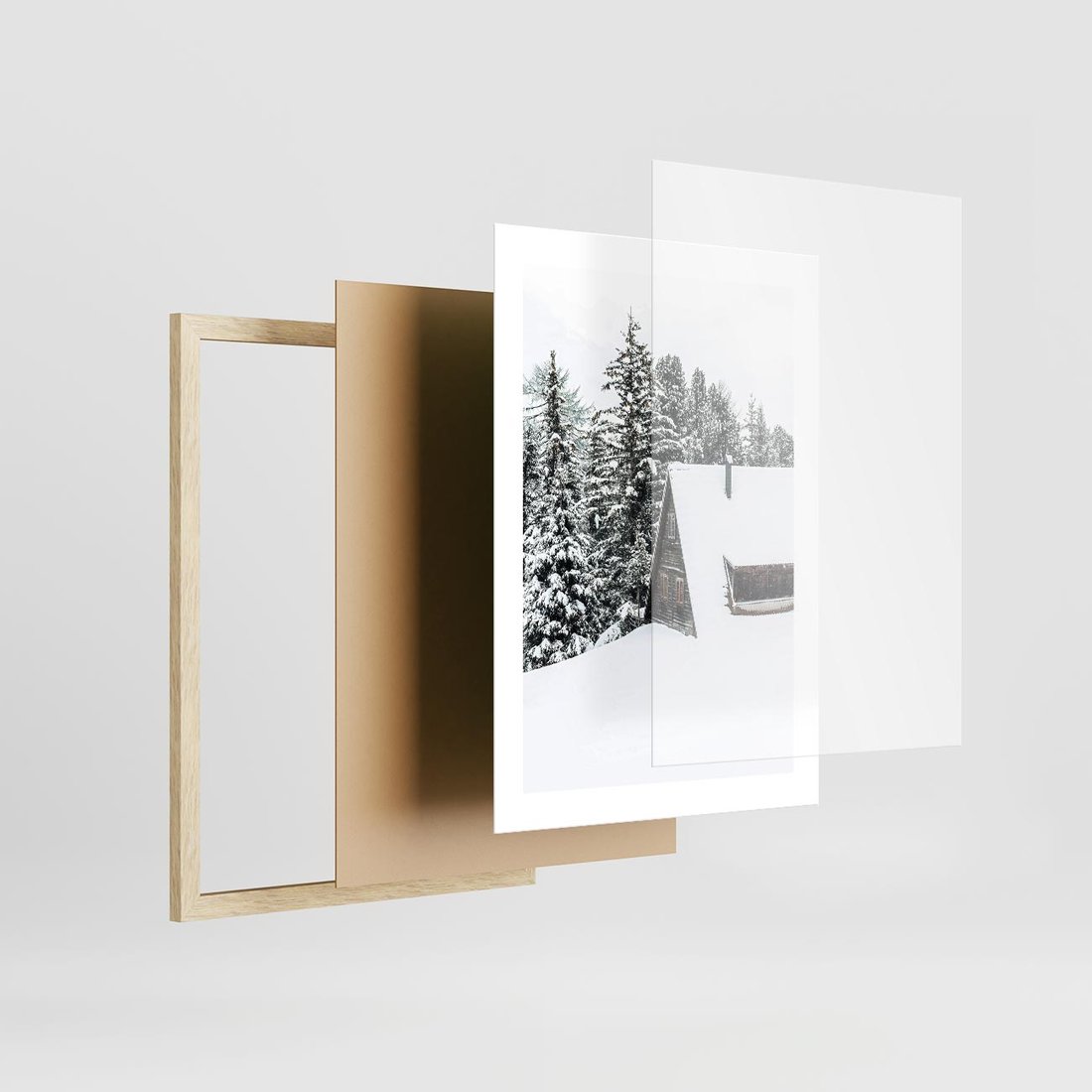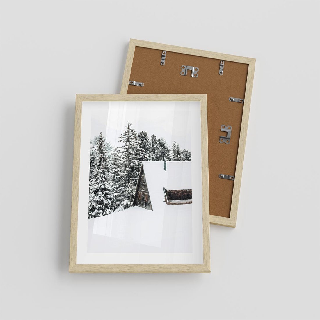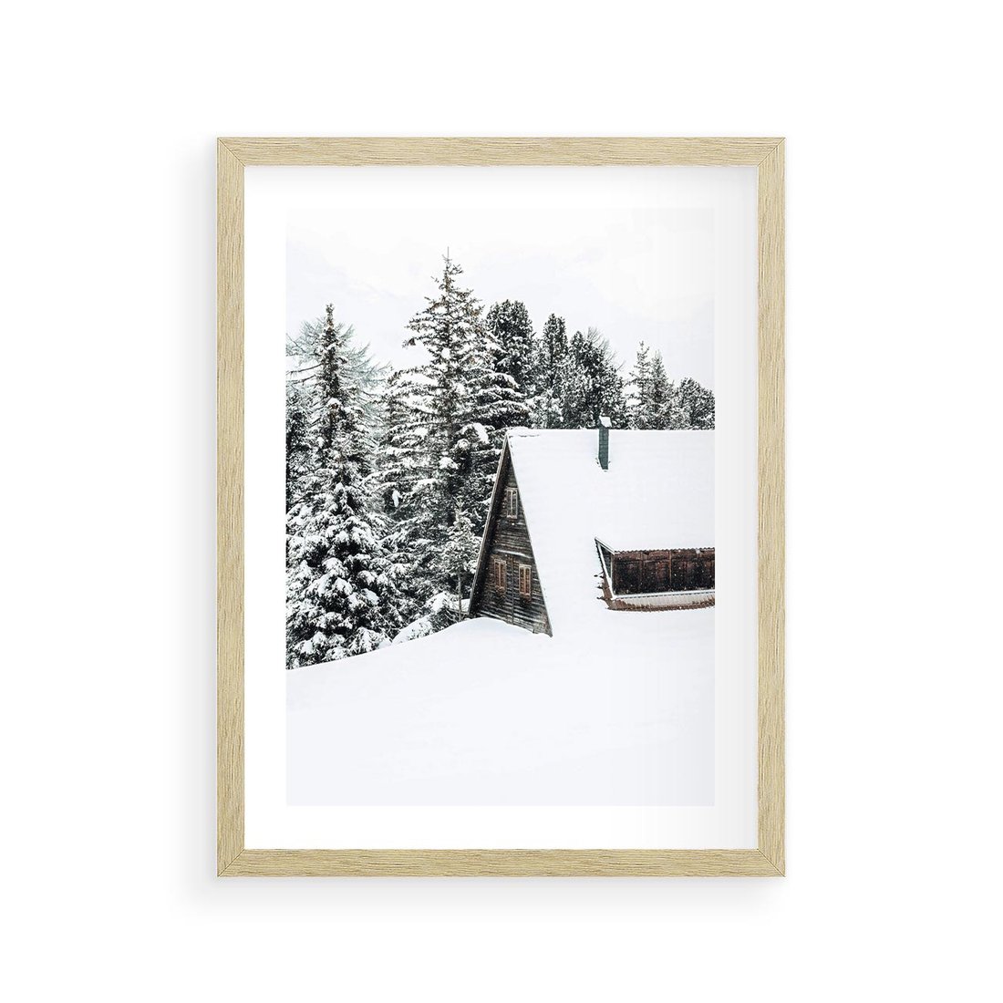 Plakat w ramie 30x40 - Zimowy Urok - śnieg, domek w górach - rama drewno