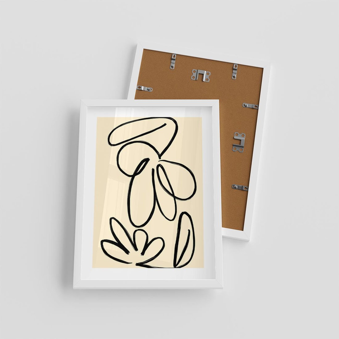 Nasza abstrakcyjna sztuka to delikatna kompozycja przypominająca kształtem kwiat. Wszystko to utrzymane jest w kontrastujących czerń i biel. To minimalizm w swojej najczystszej formie, gdzie subtelne linie tworzą elegancką i spokojną wizję, oddając hołd prostocie i pięknu.