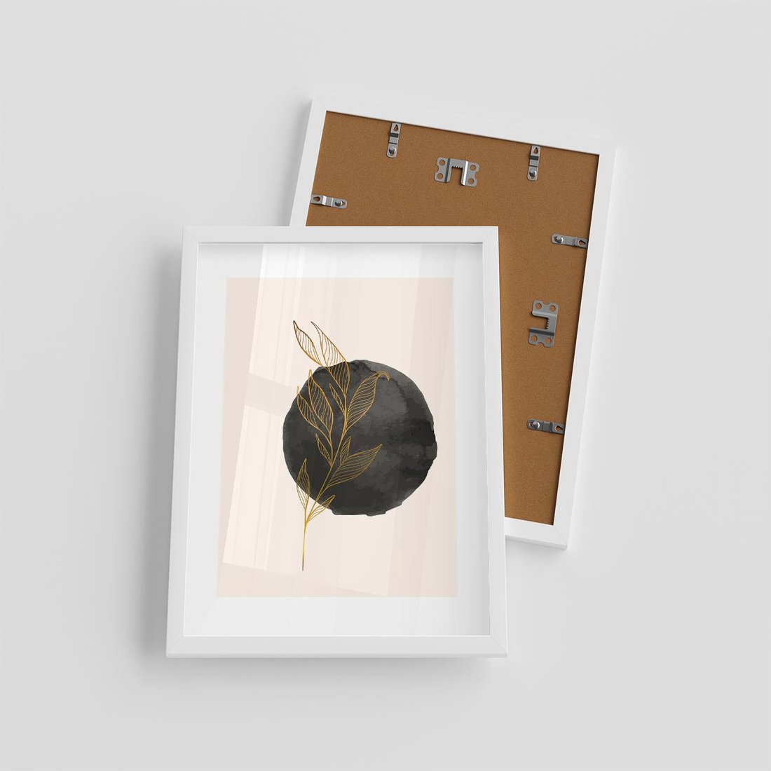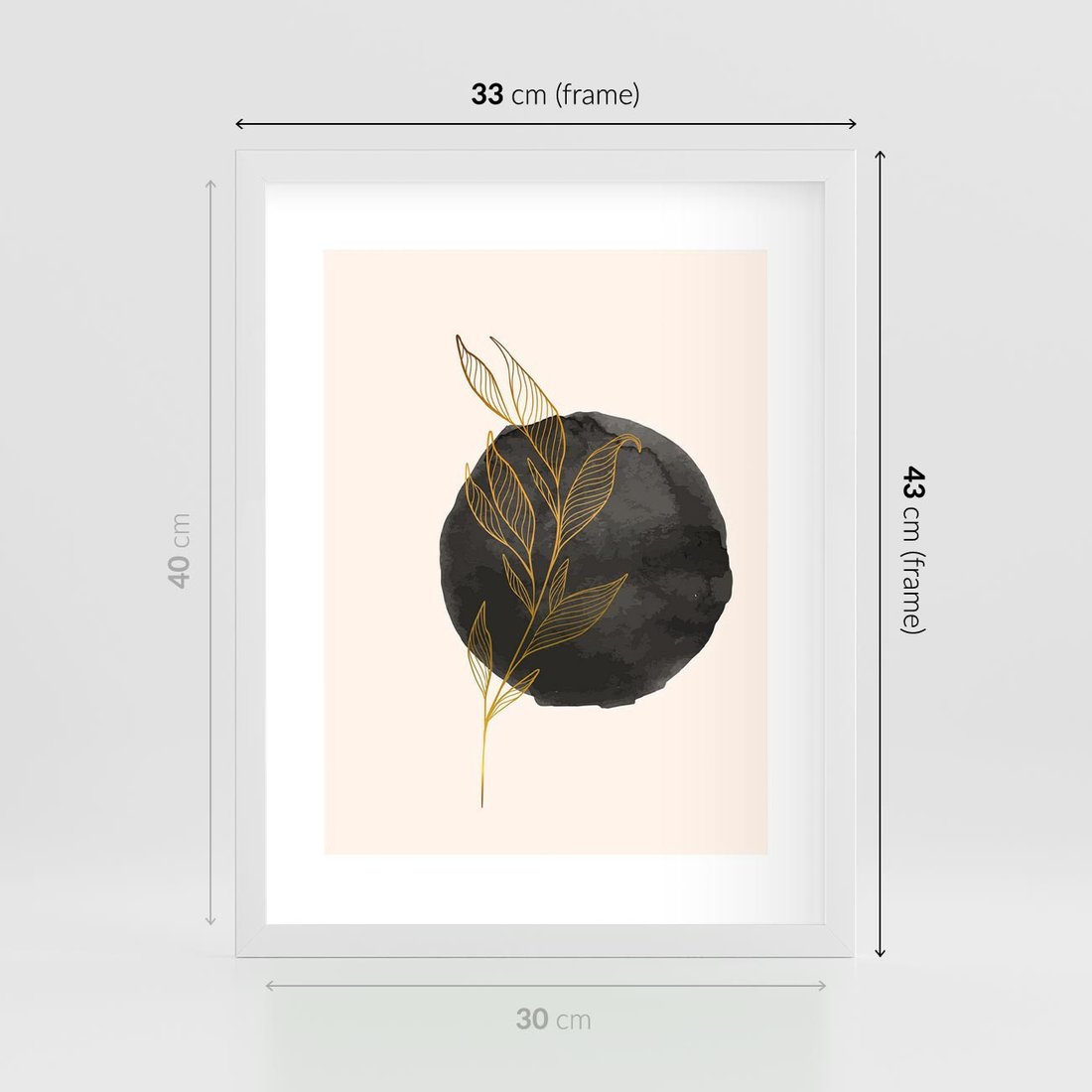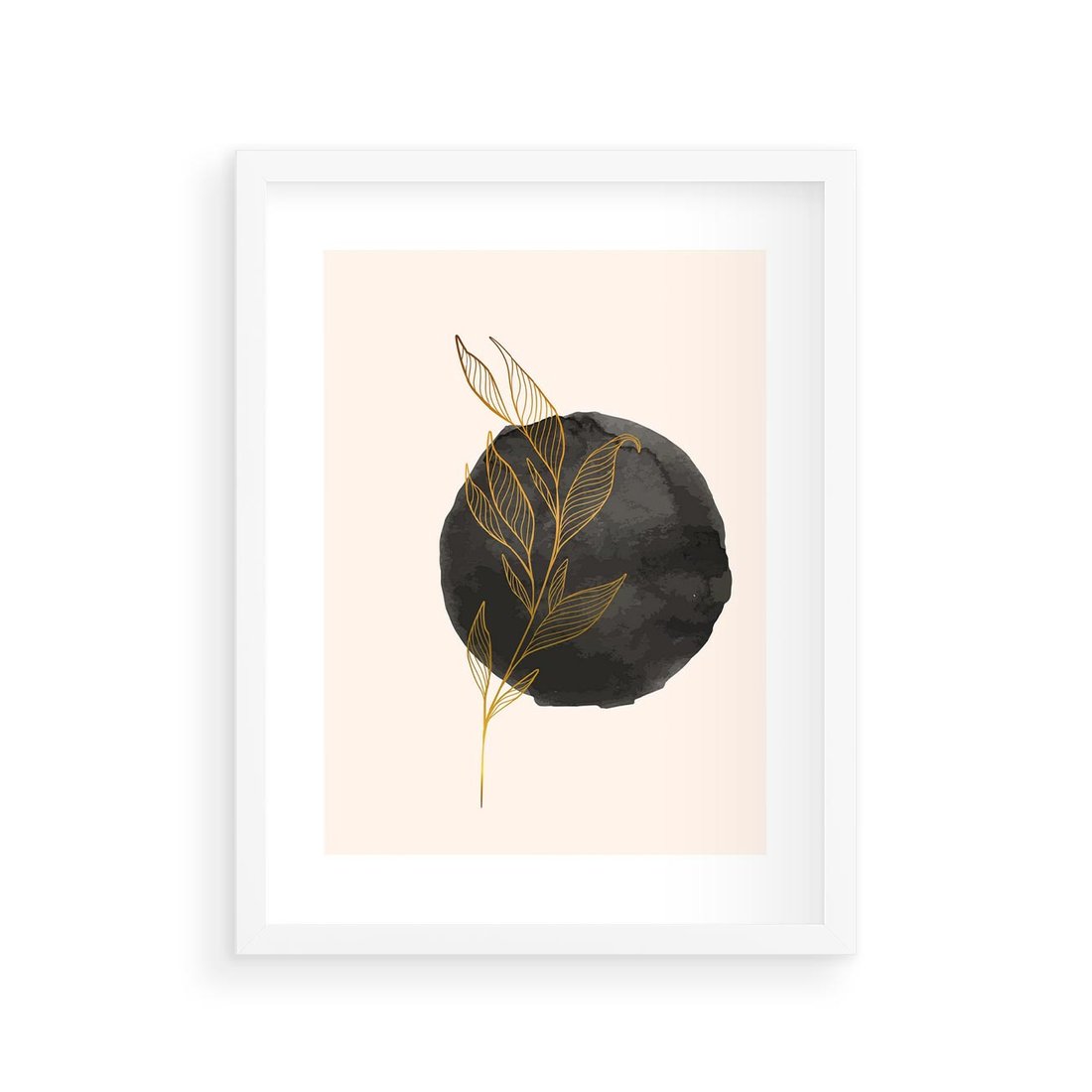 Plakat w ramie 30x40 - Złota Gałązka na Tle Akwarelowej Ciemności - złota gałązka, czarna plama akwarelowa w tle - rama biała