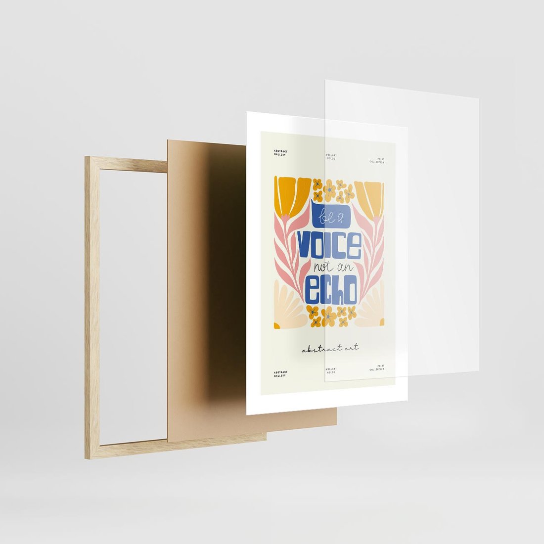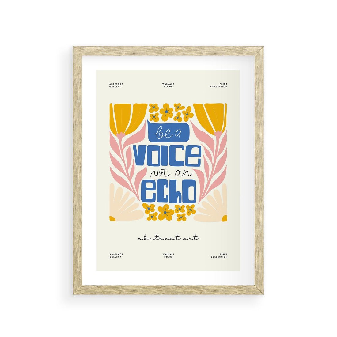 Ten nowoczesny plakat ukazuje kwiaty w harmonii z wyrazistą typografią, w odcieniach błękitu i żółci. Sztuka ta tworzy unikalną wizję estetyki, łącząc siłę słów z pięknem natury w odważnej i nowoczesnej kompozycji.