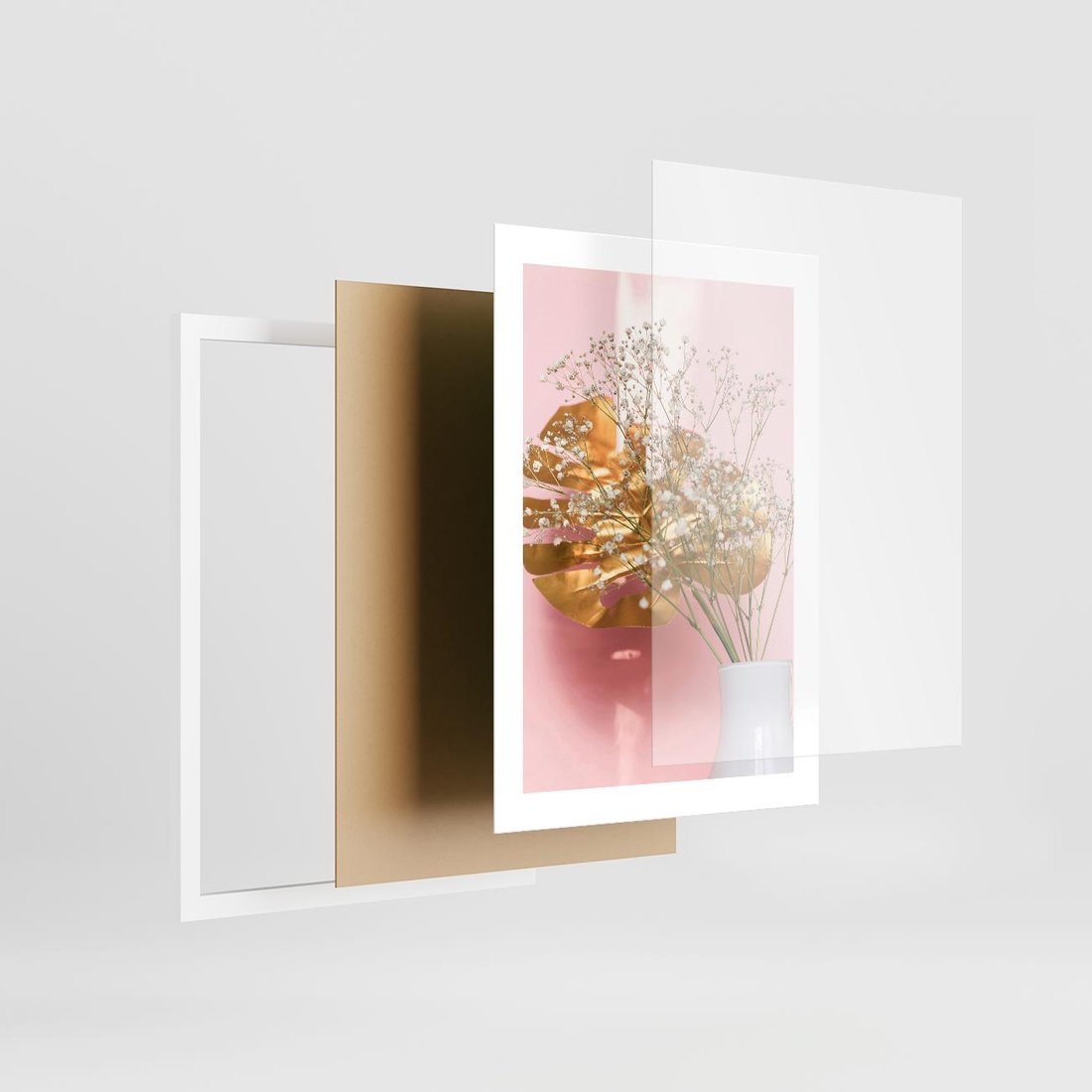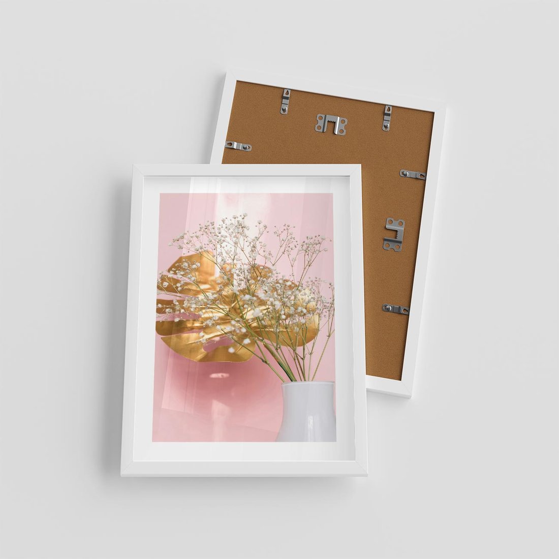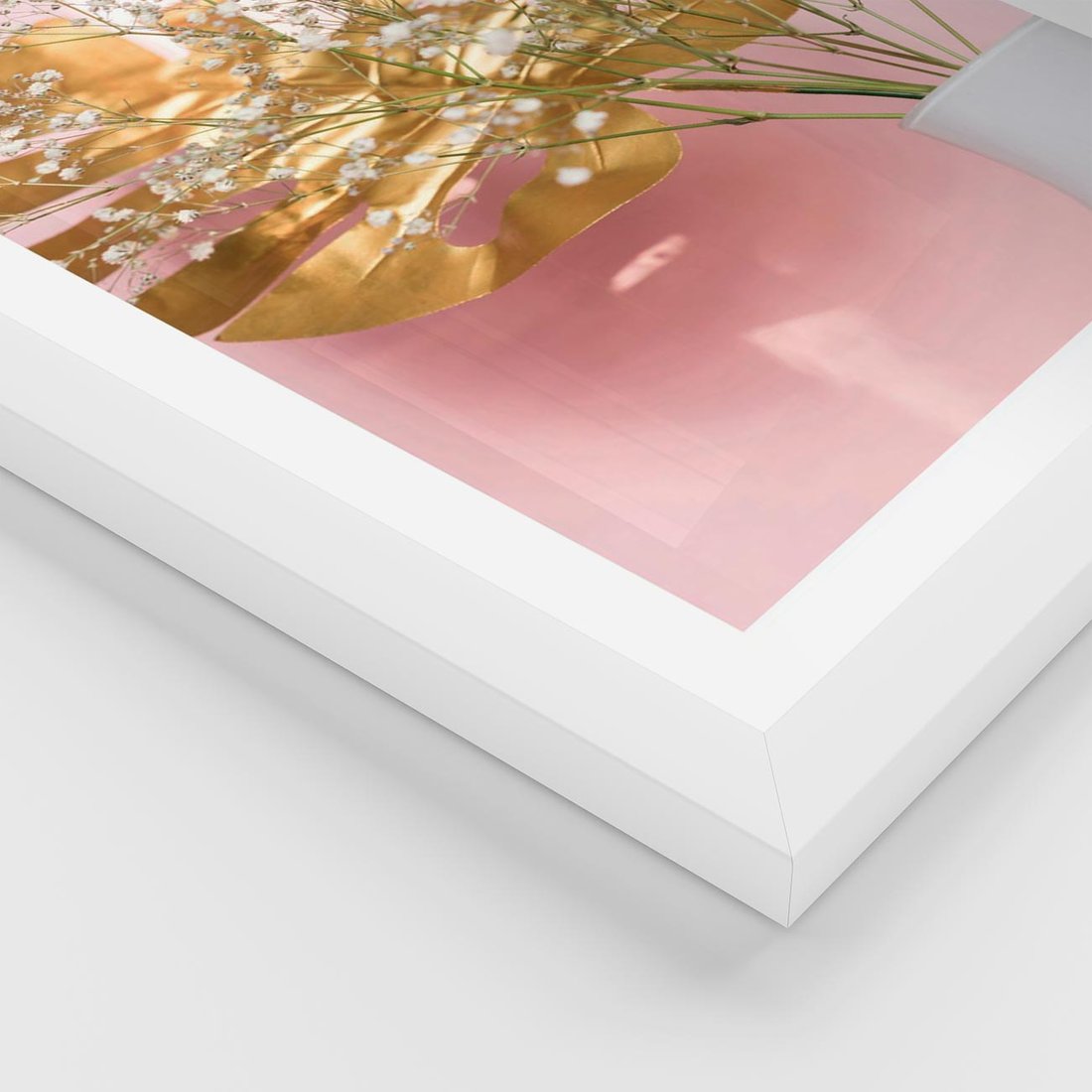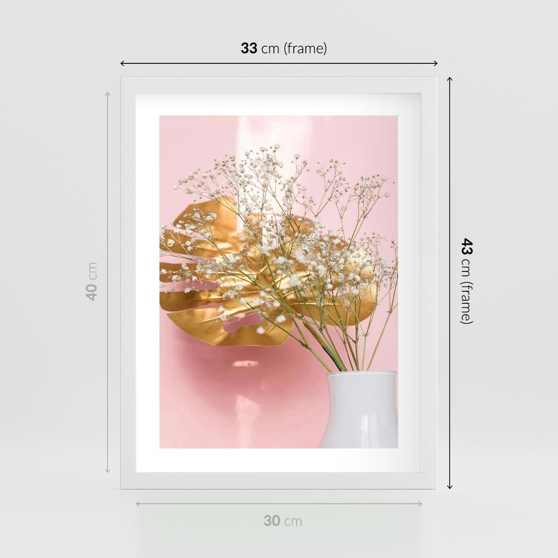 Plakat w ramie 30x40 - Złoty Akcent - złoty liść montery, gipsówka - rama biała