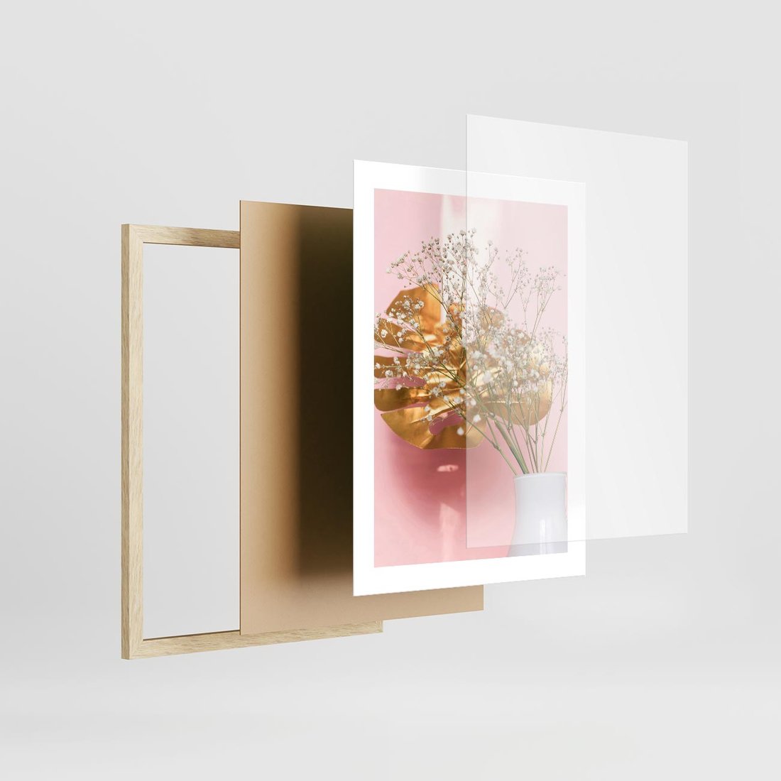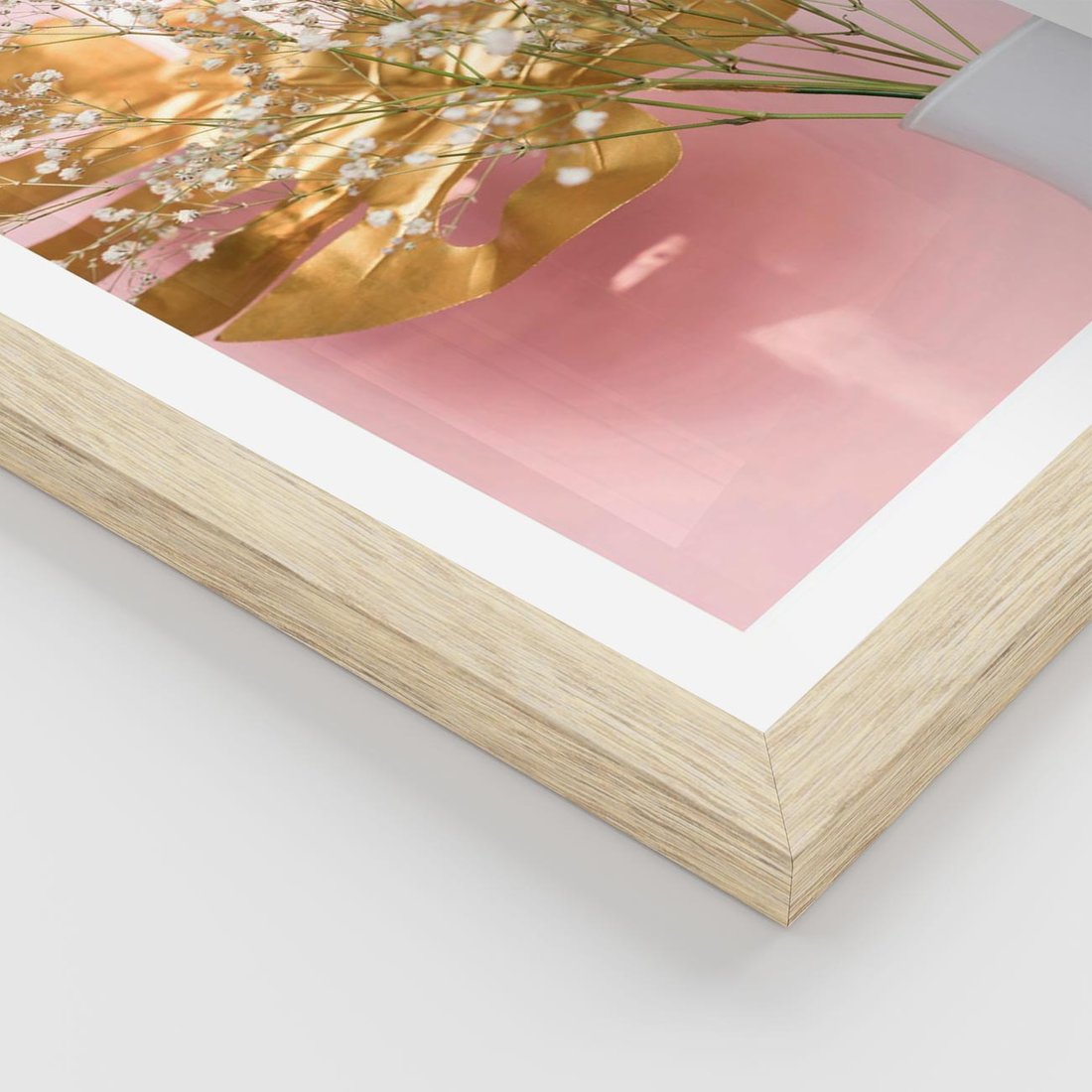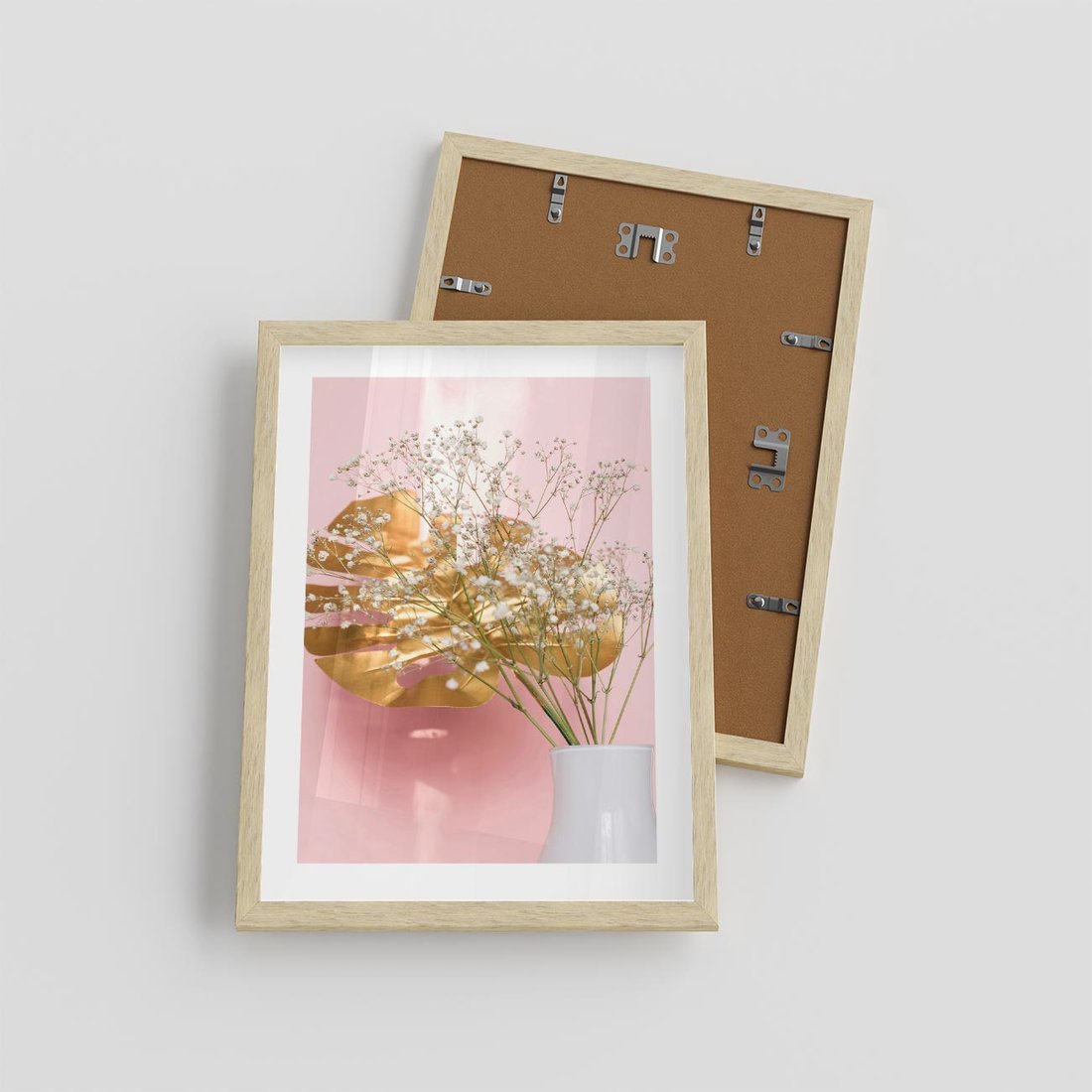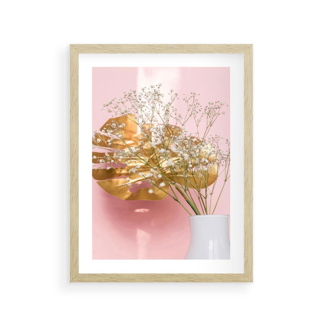 Plakat w ramie 30x40 - Złoty Akcent - złoty liść montery, gipsówka - rama drewno