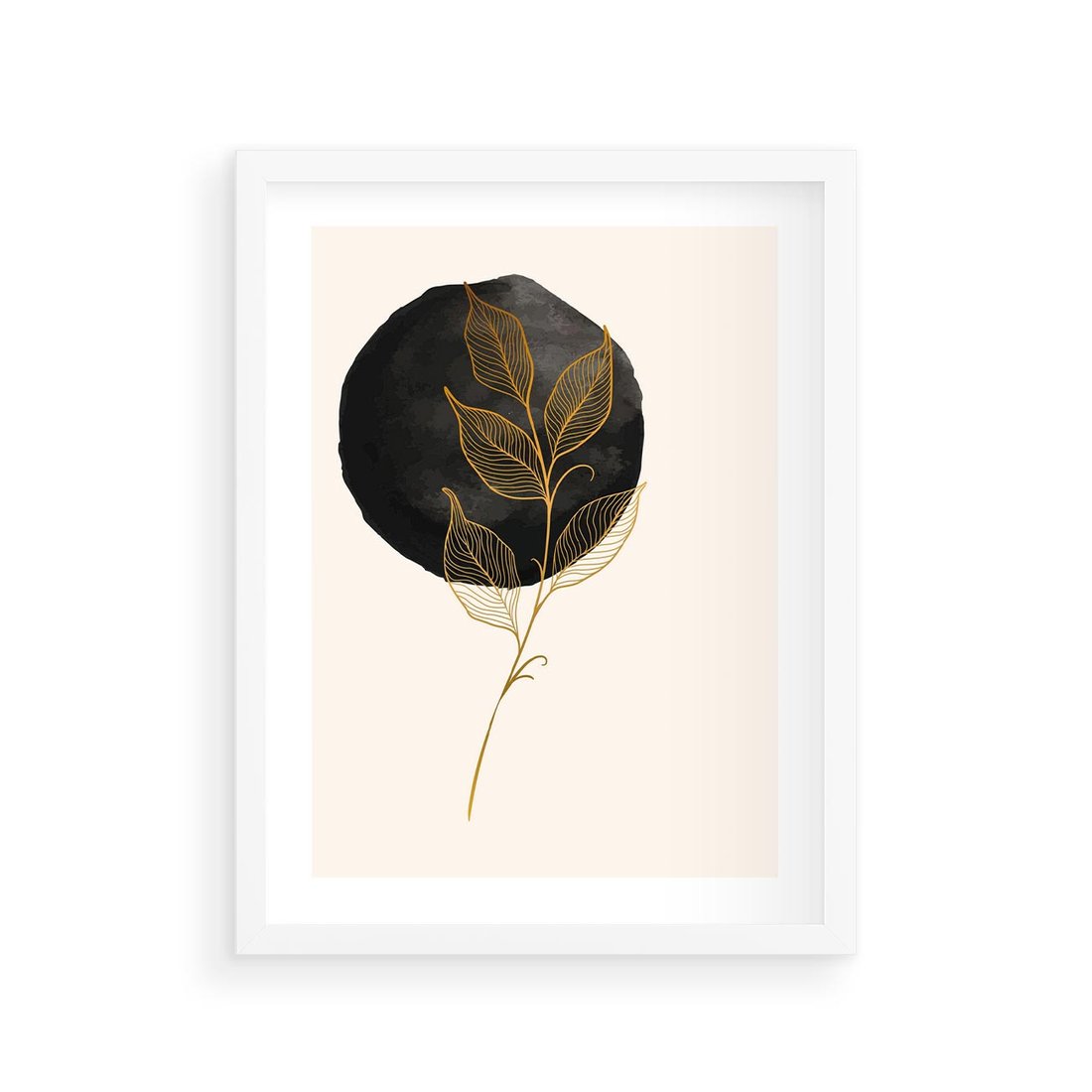 Plakat w ramie 30x40 - Złoty Liść na Czarnej Plamie - grafika, złoty liść - rama biała