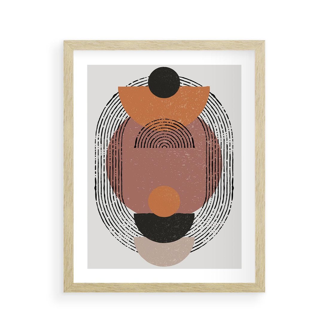 Obraz przedstawia abstrakcyjną grafikę z geometrią w odcieniach brązów i beży. Ta kompozycja artystyczna doskonale oddaje równowagę i spokój, idealnie pasując do wnętrz, które pragną wyrazić nowoczesność i harmonię.