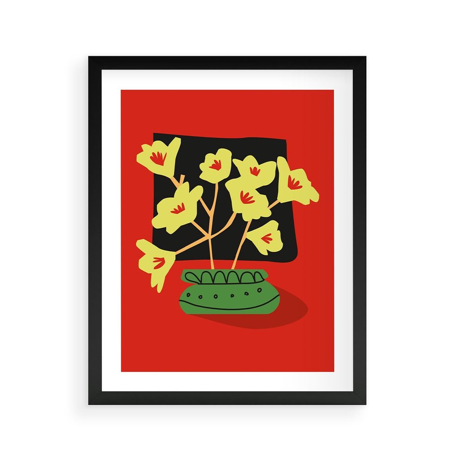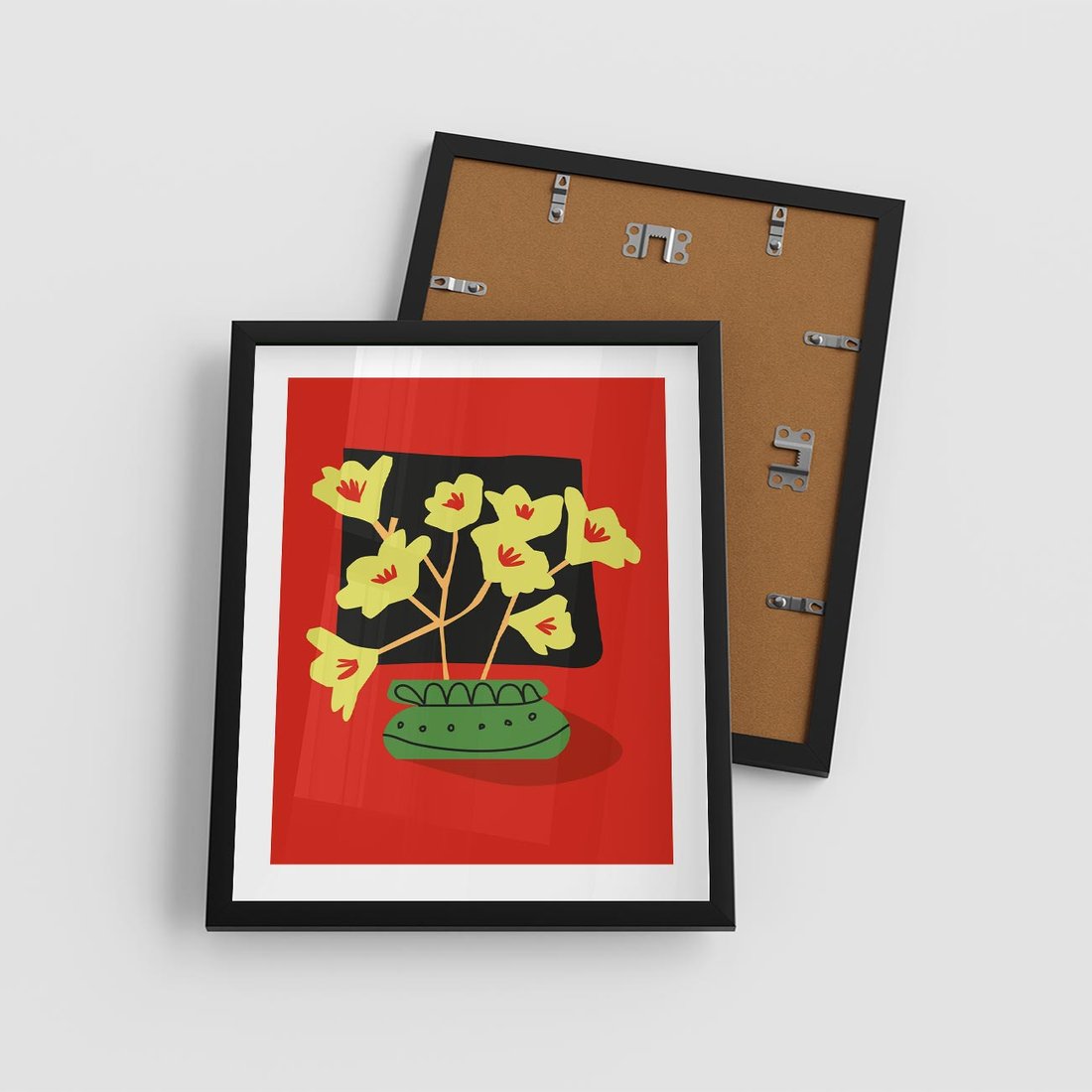 Ten nowoczesny plakat ukazuje abstrakcyjne kwiaty na głębokim czerwonym tle. Sztuka ta wprowadza pasję i wyrazistość do przestrzeni, tworząc zmysłową kompozycję, która przyciąga uwagę i budzi emocje.