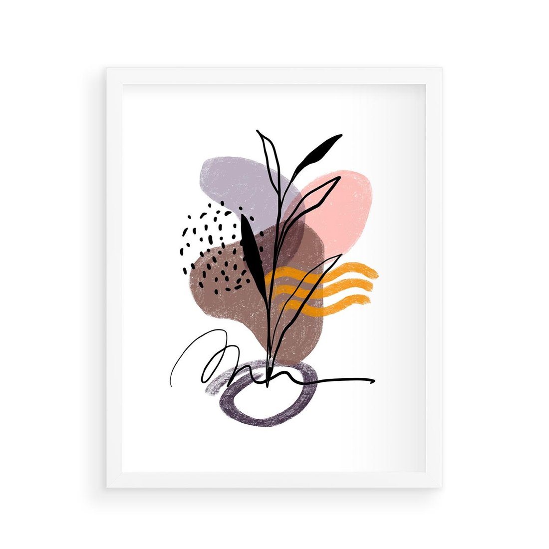 Nasza sztuka abstrakcyjna to połączenie nowoczesności i natury, prezentujące elementy roślinne w formie czarnego szkicu z akwarelowymi plamami. To twórcze połączenie wprowadza do Twojej przestrzeni unikalny wyraz artystyczny, który łączy różnorodność form i stylów.