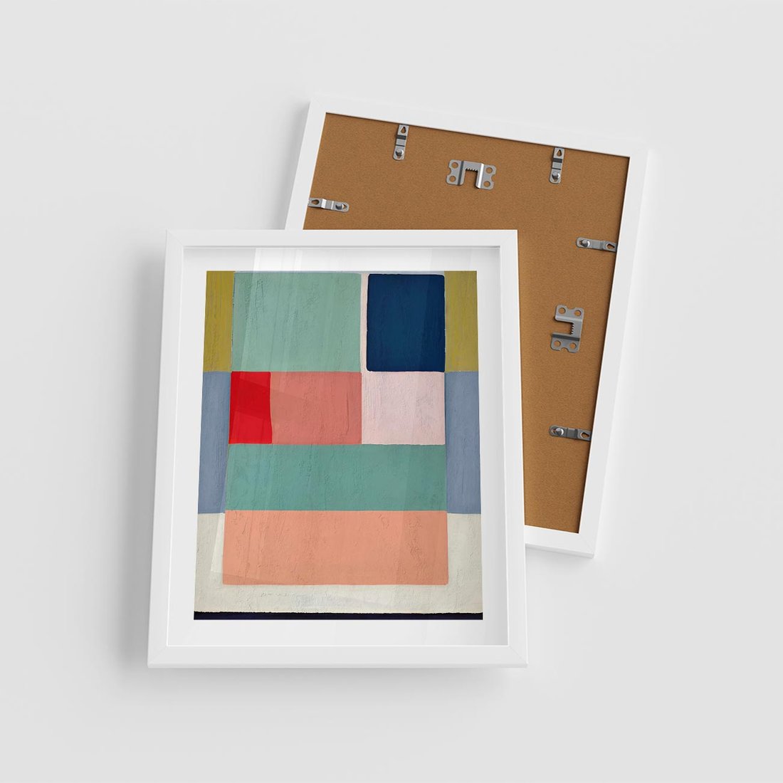 To olejny obraz o abstrakcyjnych geometrycznych kształtach, w których dominują pastelowe kolory. Prostokąty i kwadraty tworzą harmonijną kompozycję, która zachwyca swoją subtelnością i równowagą.