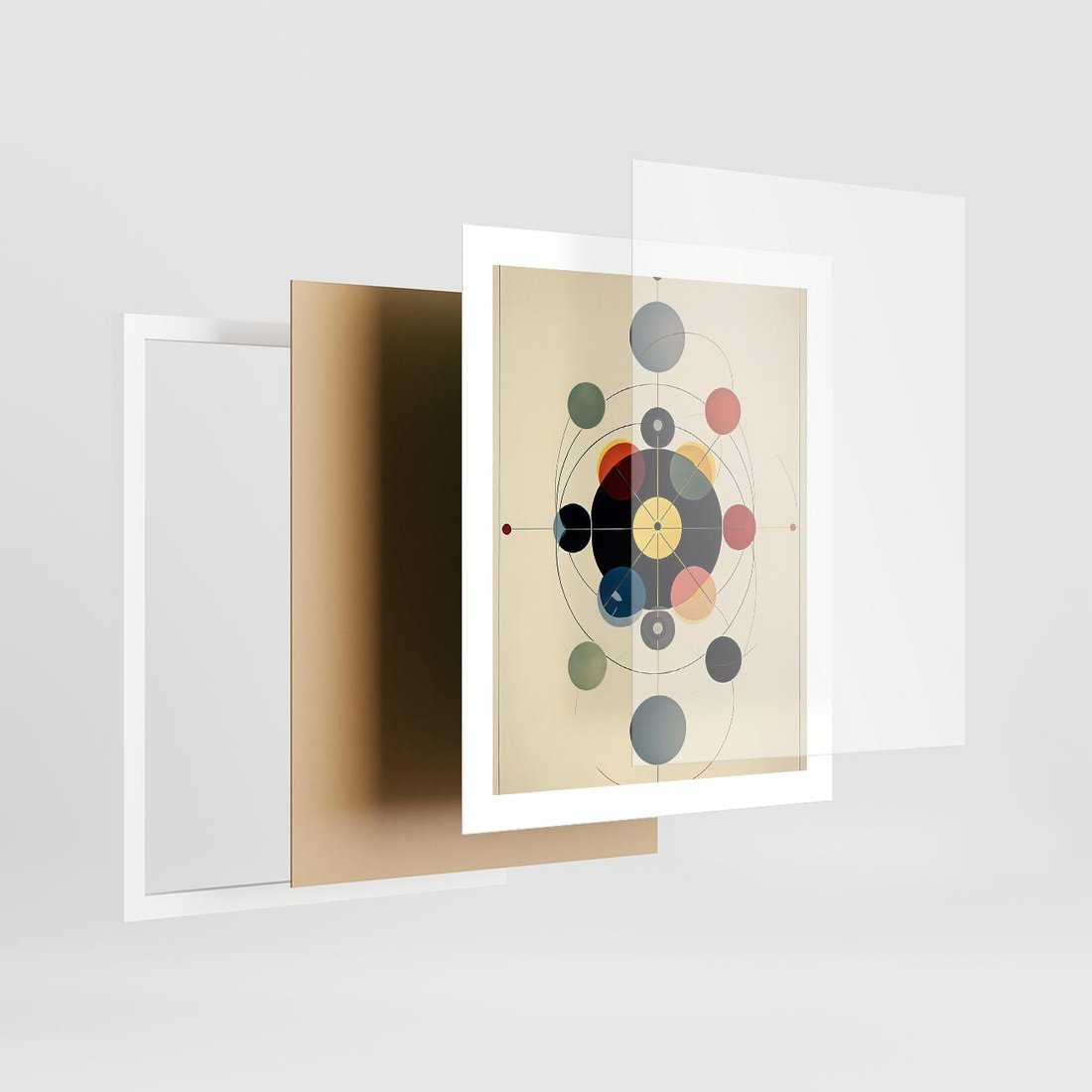 Ta abstrakcyjna geometryczna kompozycja zachwyca wyrazistymi kołami, dynamicznymi liniami i żywymi kolorami, nawiązującymi do charakterystycznego stylu Wassily'ego Kandinsky'ego. To wizualna podróż w świat abstrakcji i emocji.