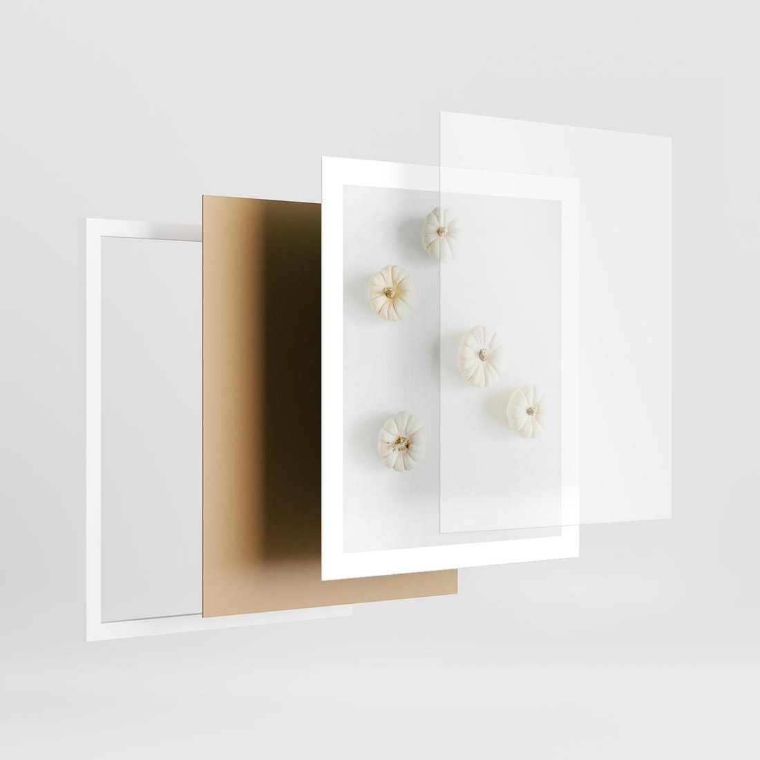 To ujęcie białych dyni na białym tle, nawiązujące do klimatu jesieni. Obraz ten oddaje spokój i prostotę natury.