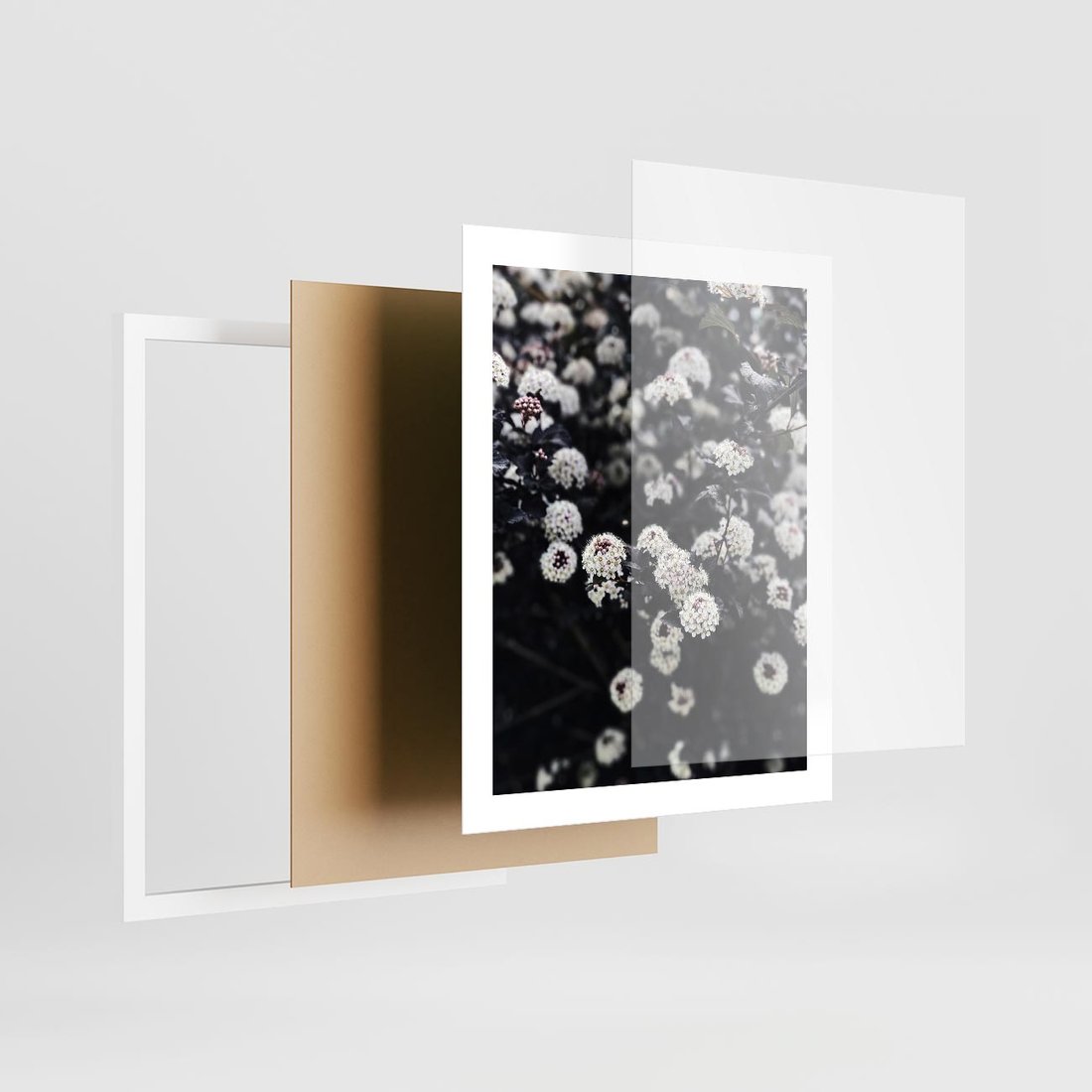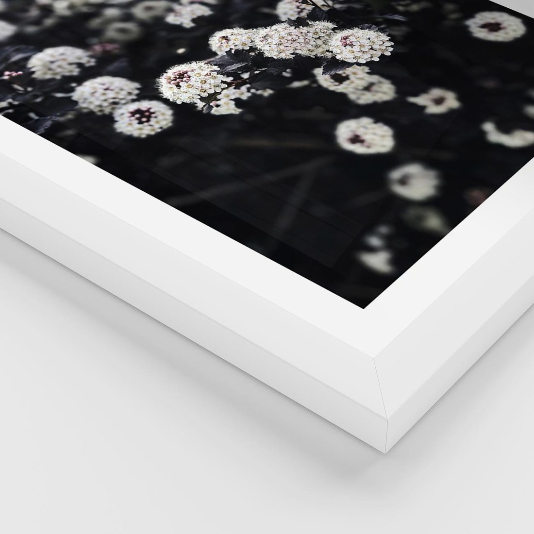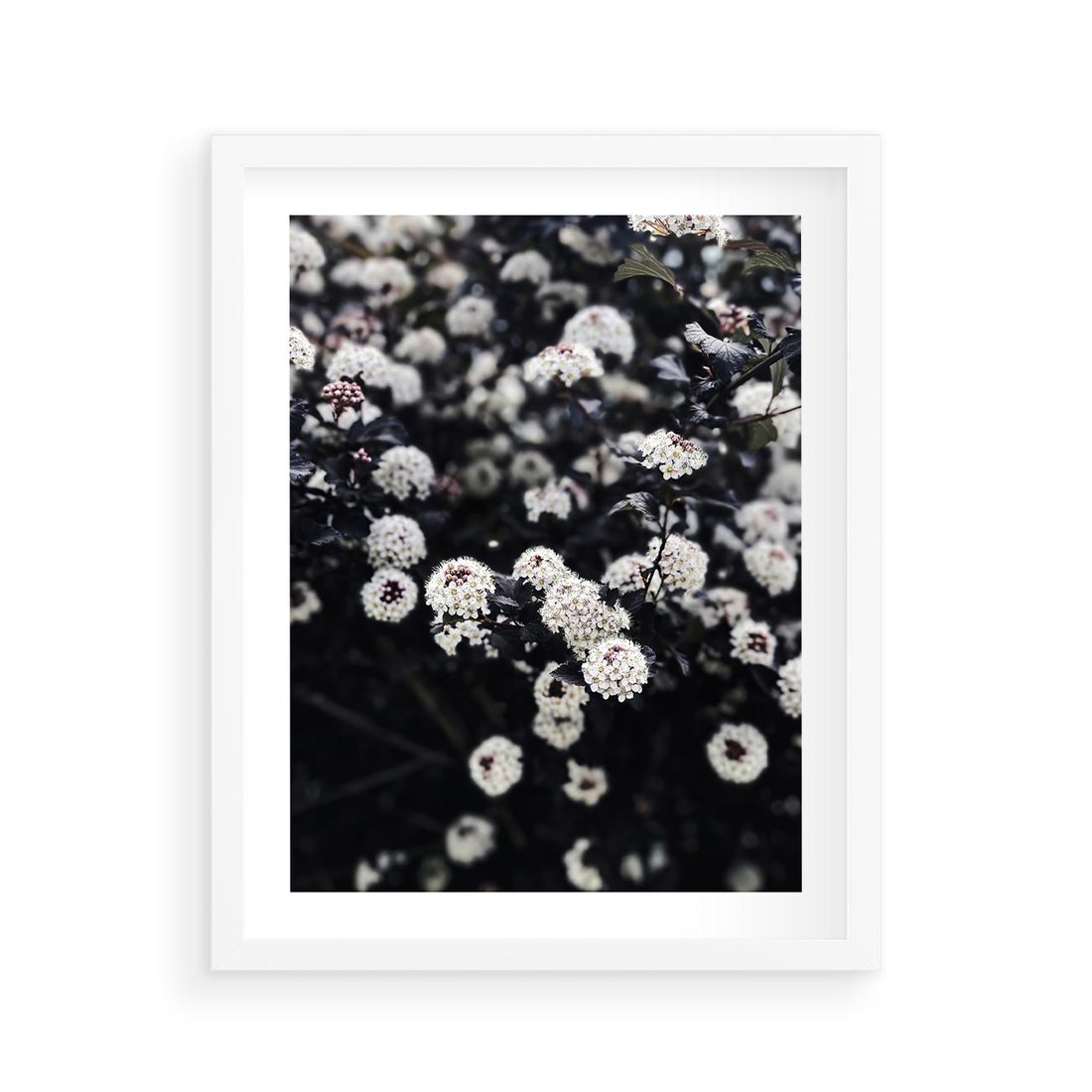 Plakat w ramie 40x50 - Białe Kwiaty na Kwitnącym Krzewie - białe kwiaty, kwitnący krzew - rama biała