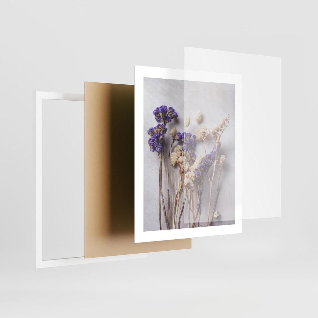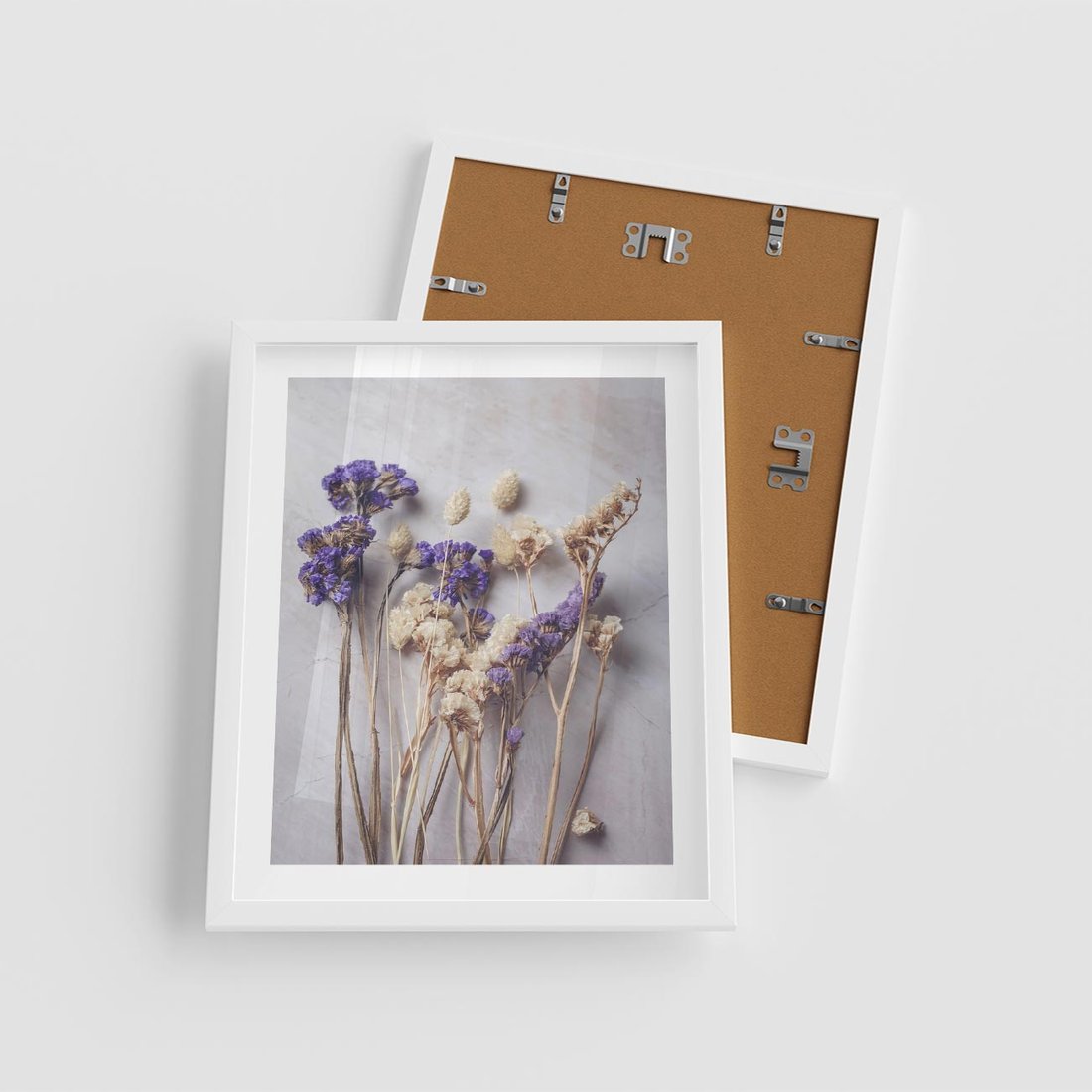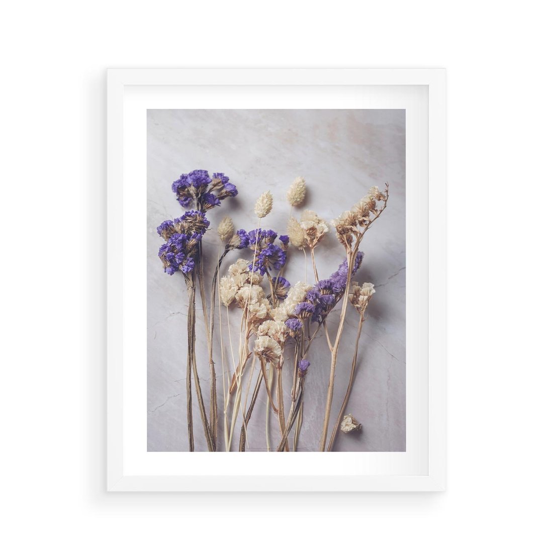Obraz przedstawia delikatną kompozycję z suszonymi błękitnymi i białymi kwiatami. Ta artystyczna kompozycja idealnie pasuje do wnętrz o romantycznym lub minimalistycznym charakterze, dodając subtelny i elegancki akcent.