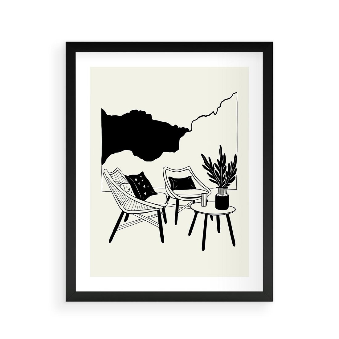 Ten biało-czarny rysunek doskonale wpisuje się w boho wnętrze salonu, łącząc nowoczesną sztukę z duchem swobodnego stylu. Kreuje on harmonijną atmosferę, dodając salonowi wyjątkowy urok.