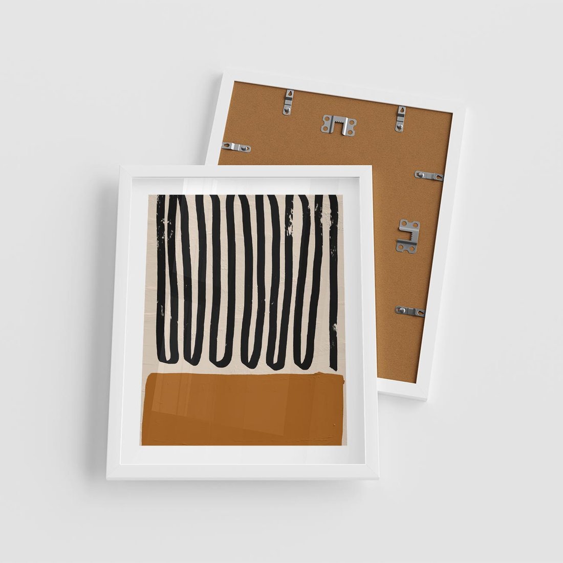 Ten abstrakcyjny plakat w odcieniach brązu zachwyca wyrazistymi czarnymi falowanymi liniami, tworząc dynamiczną kompozycję. Idealny dodatek do nowoczesnych wnętrz.