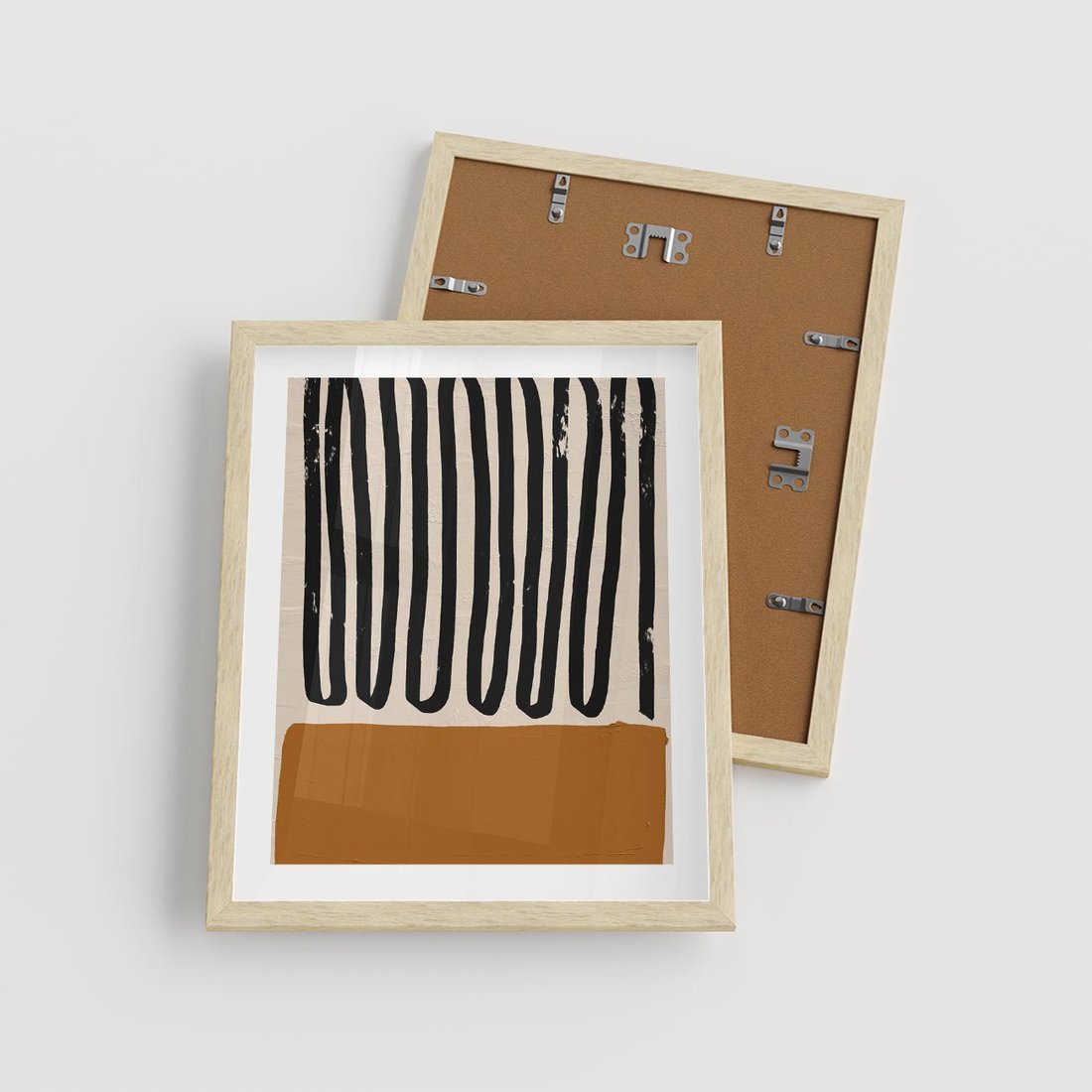 Ten abstrakcyjny plakat w odcieniach brązu zachwyca wyrazistymi czarnymi falowanymi liniami, tworząc dynamiczną kompozycję. Idealny dodatek do nowoczesnych wnętrz.
