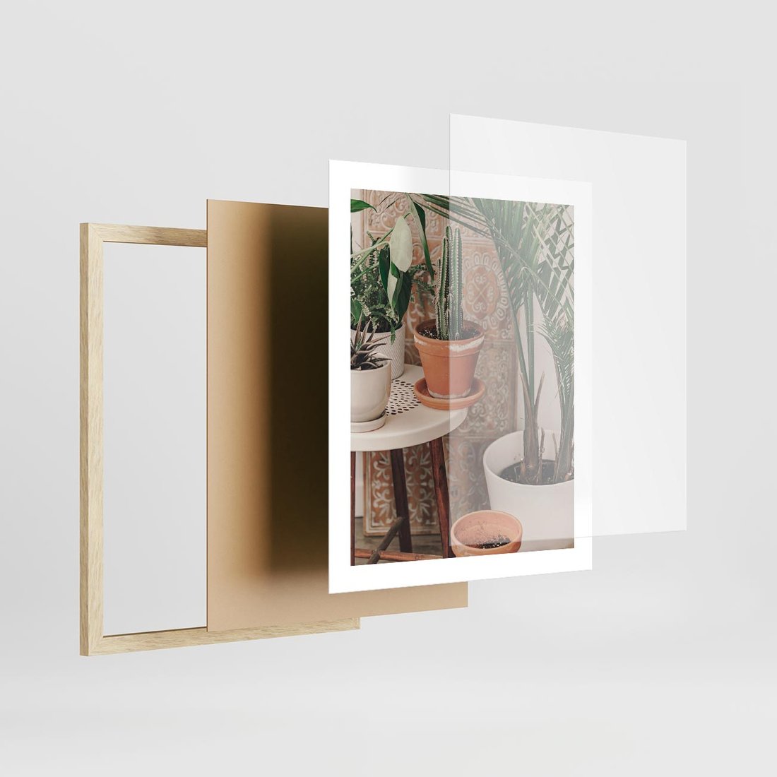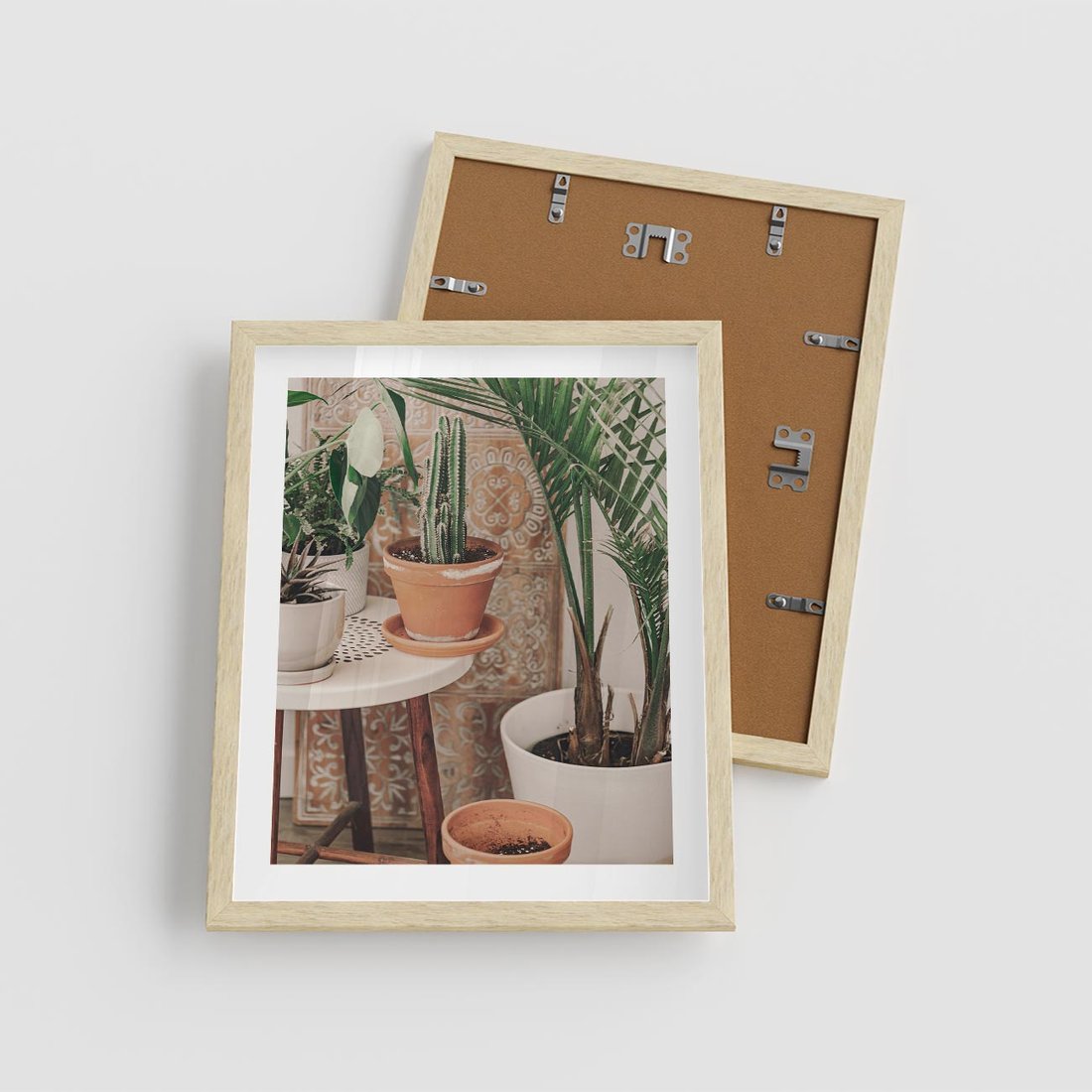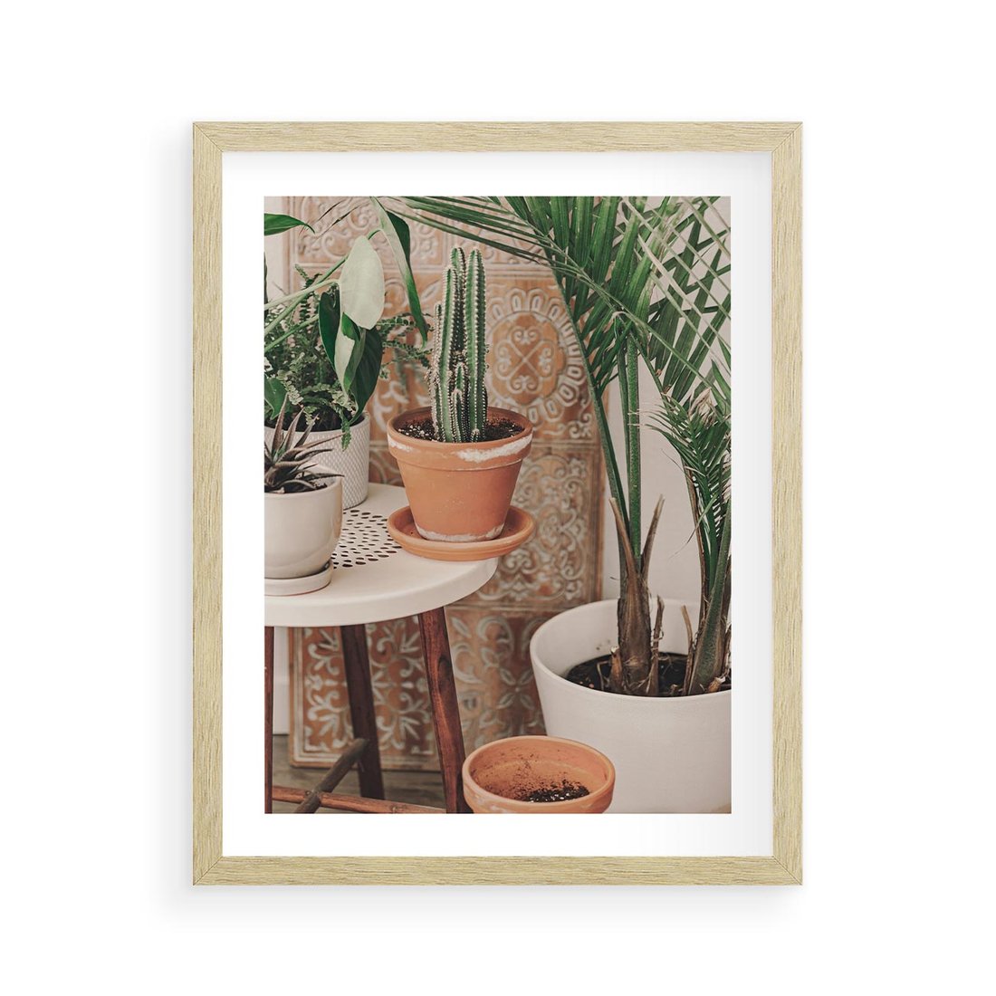 Plakat w ramie 40x50 - Boho Oaza: Kaktusy w Doniczkach - rośliny kaktusy w doniczkach, boho wnętrze - rama drewno