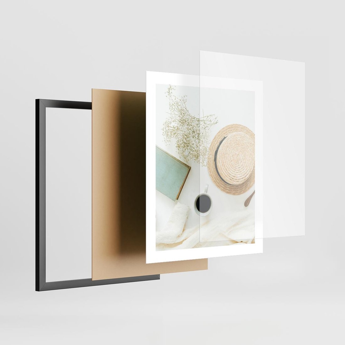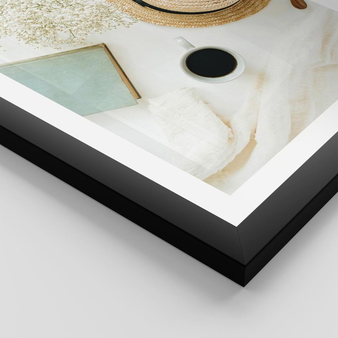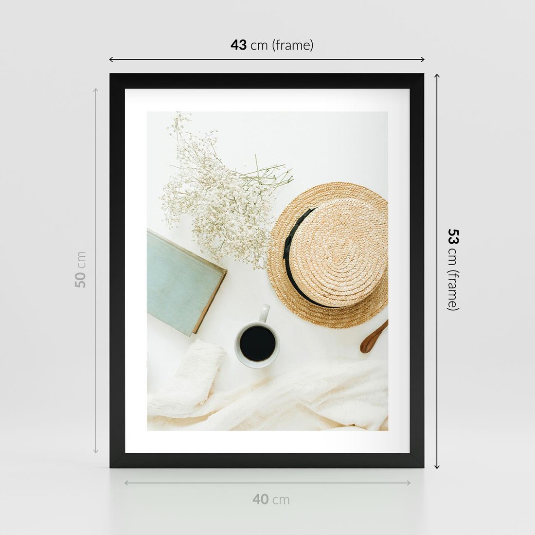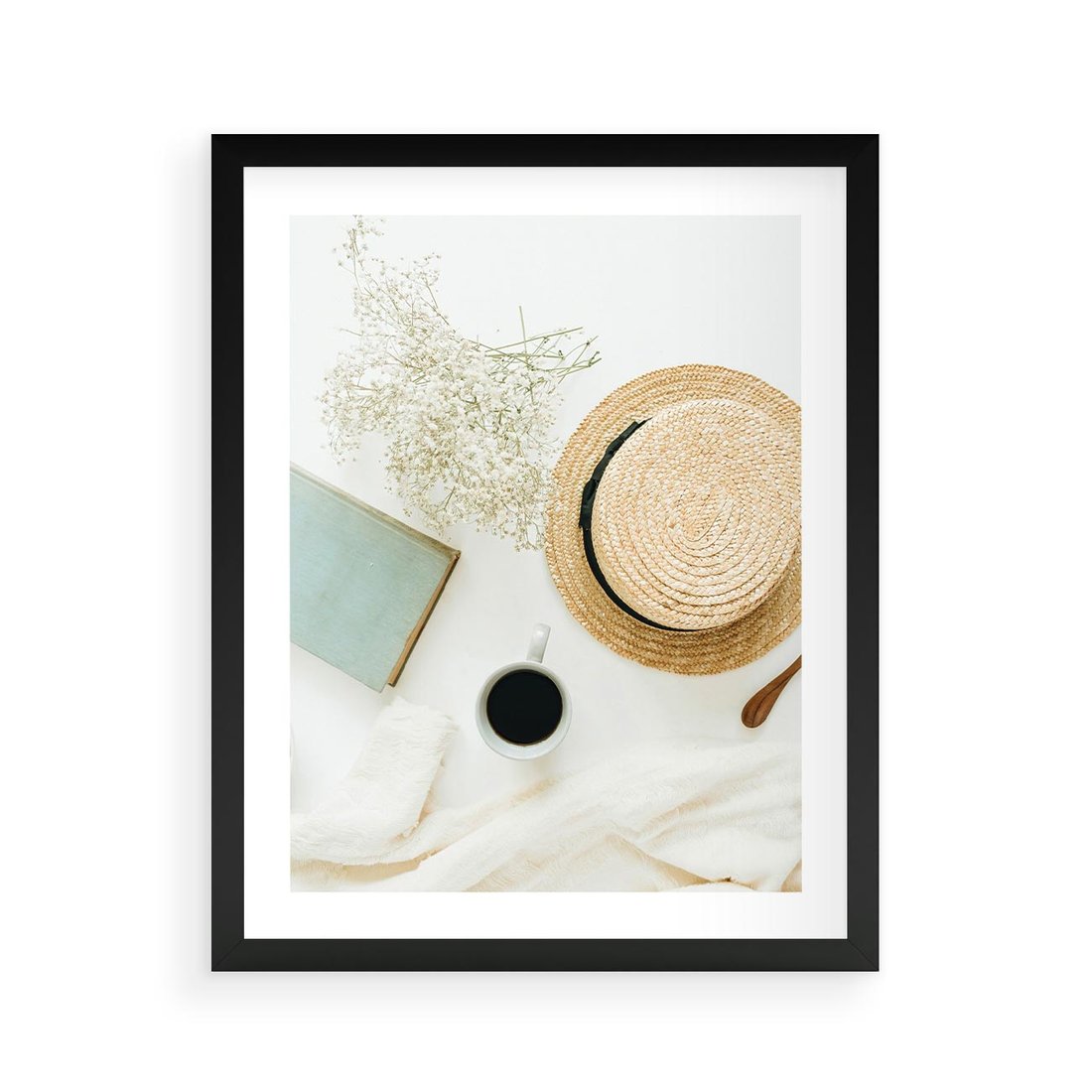 Plakat w ramie 40x50 - Boho Urok - kompozycja boho, slomkowy kapelusz - rama czarna
