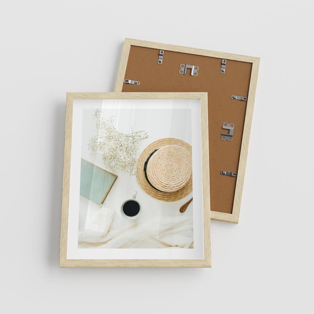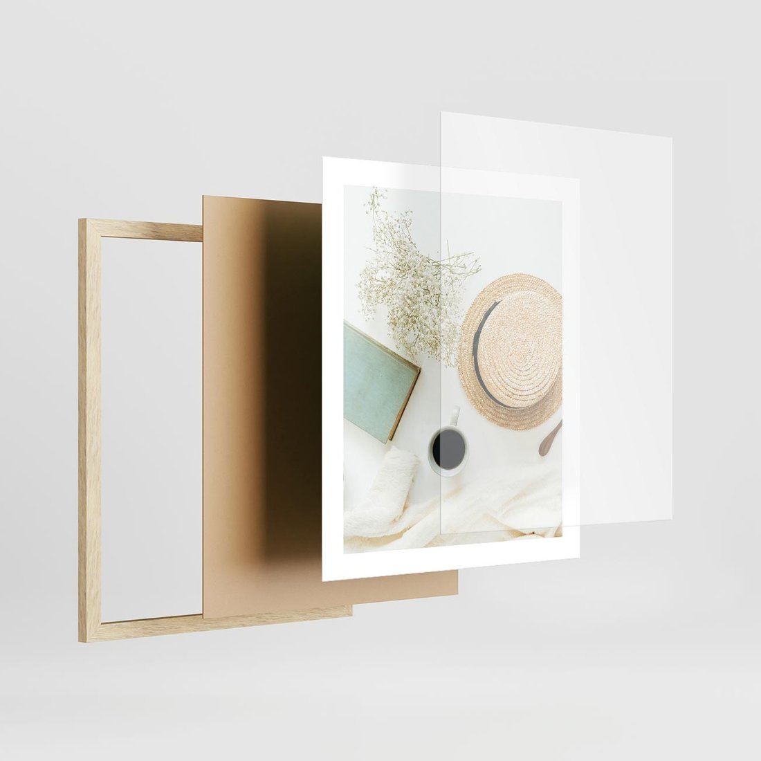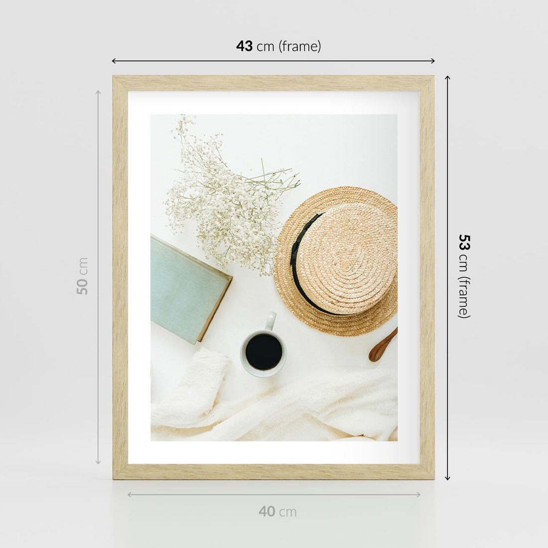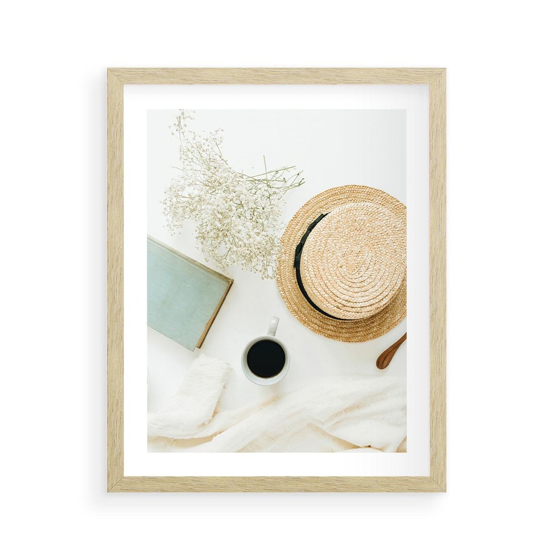 Plakat w ramie 40x50 - Boho Urok - kompozycja boho, slomkowy kapelusz - rama drewno