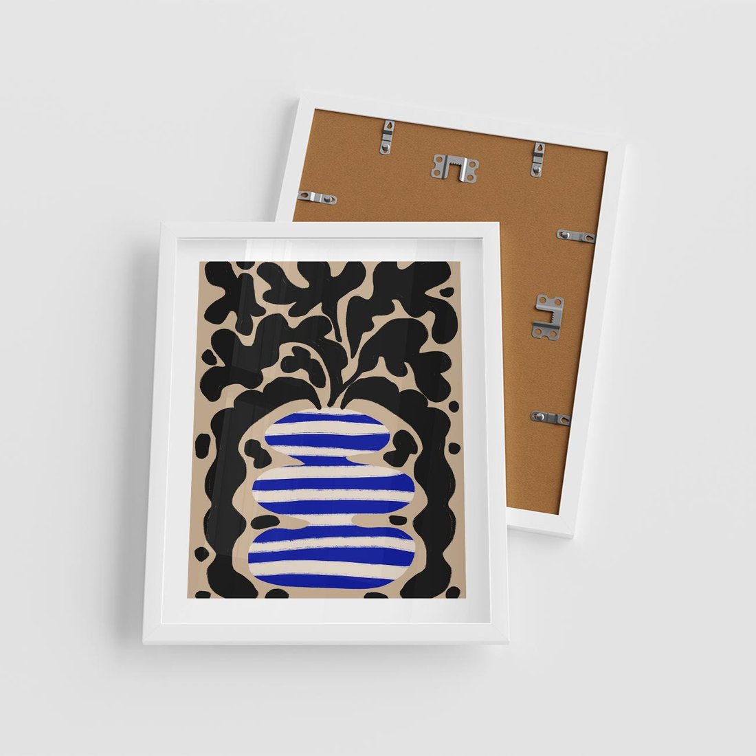 Ten abstrakcyjny plakat prezentuje fascynujące formy, które mogą przypominać wazon w biało-niebieskie pasy, a w nim umieszczone są stylizowane, czarne liście. To wyjątkowy dodatek do każdego wnętrza.