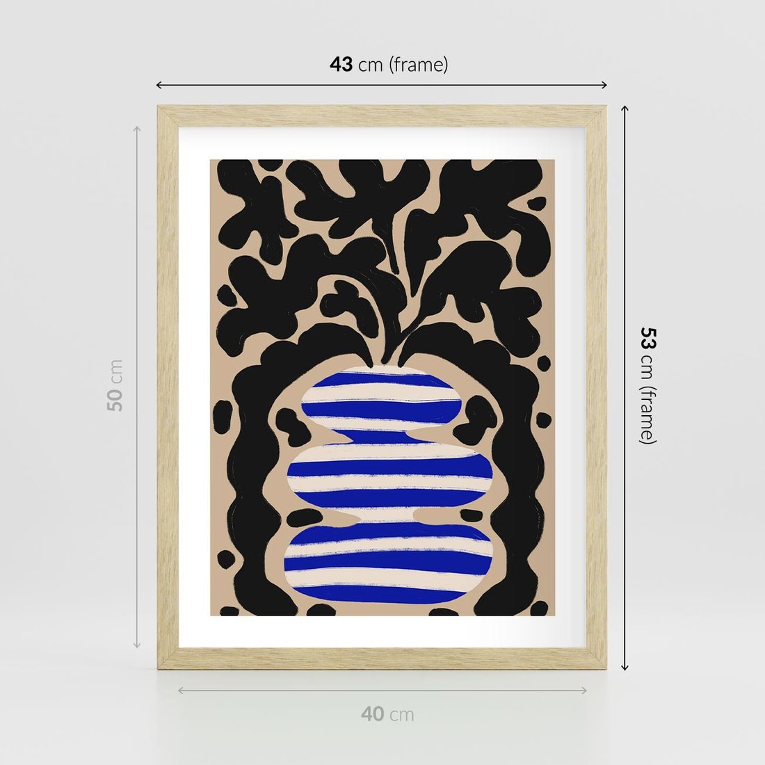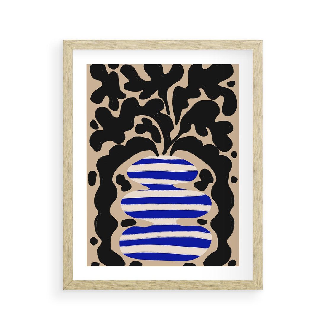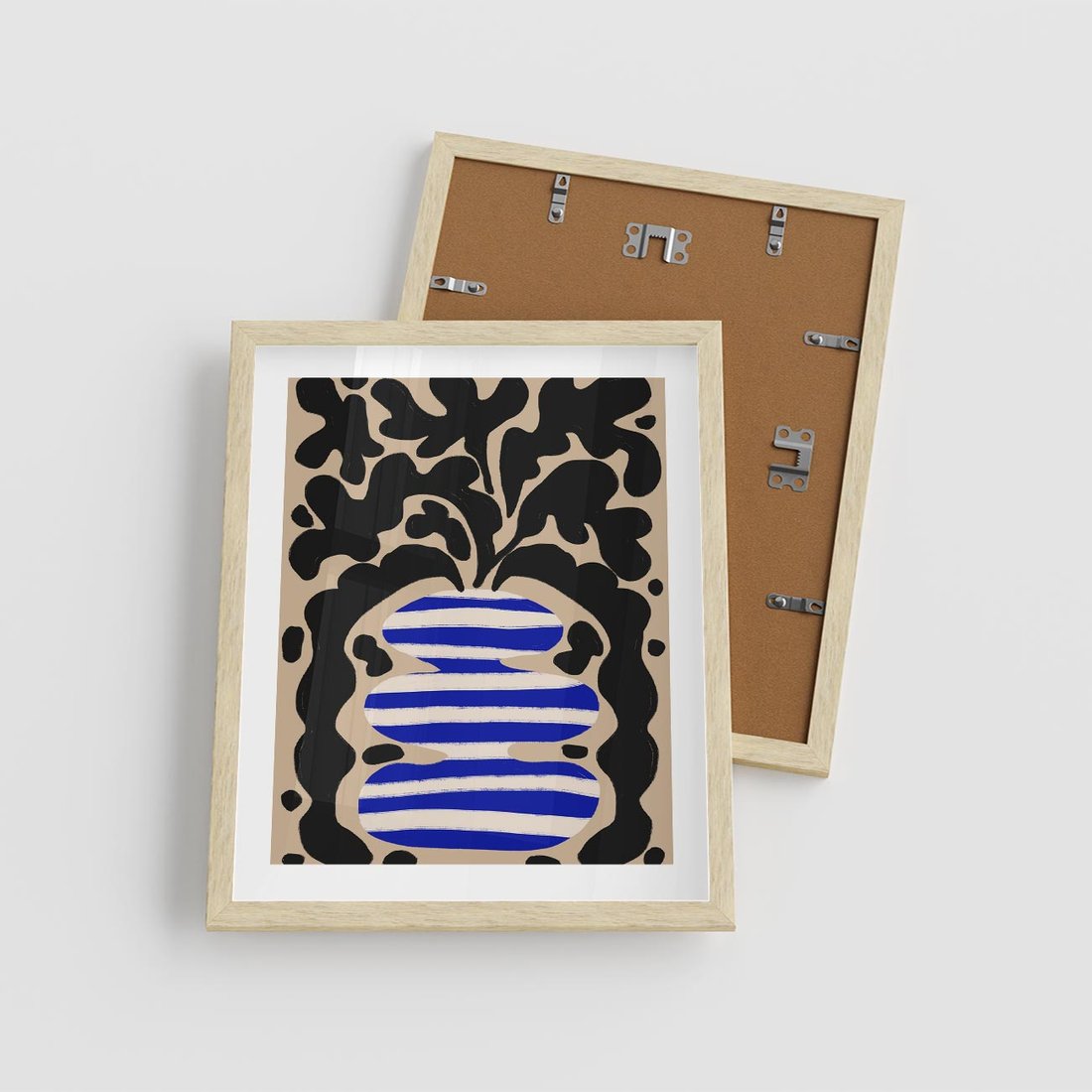 Ten abstrakcyjny plakat prezentuje fascynujące formy, które mogą przypominać wazon w biało-niebieskie pasy, a w nim umieszczone są stylizowane, czarne liście. To wyjątkowy dodatek do każdego wnętrza.