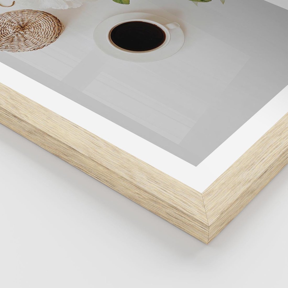 Plakat w ramie 40x50 - Bukiet Kwiatów i Kawa na Stole - fotografia, na stole bukiet - rama drewno