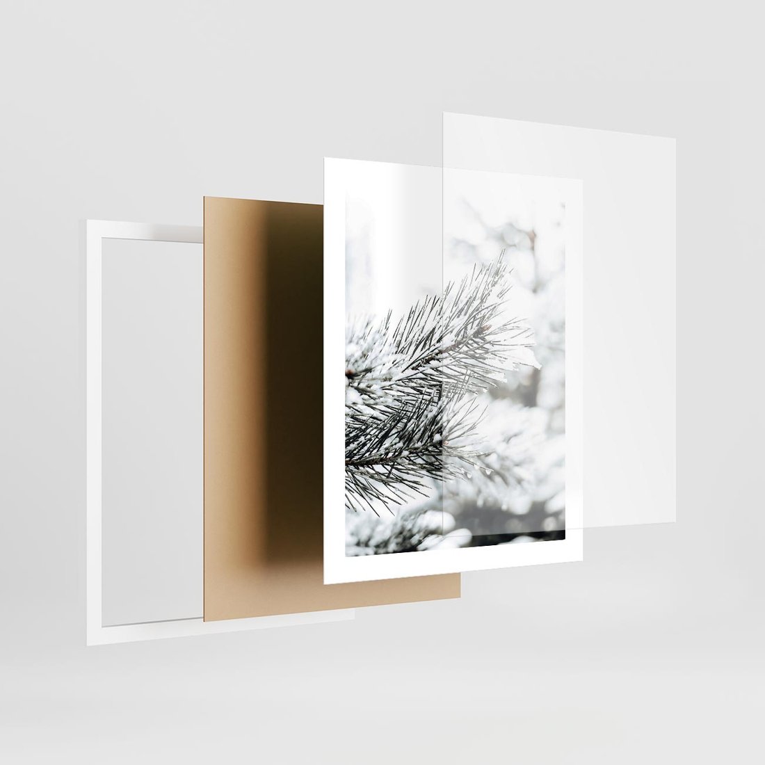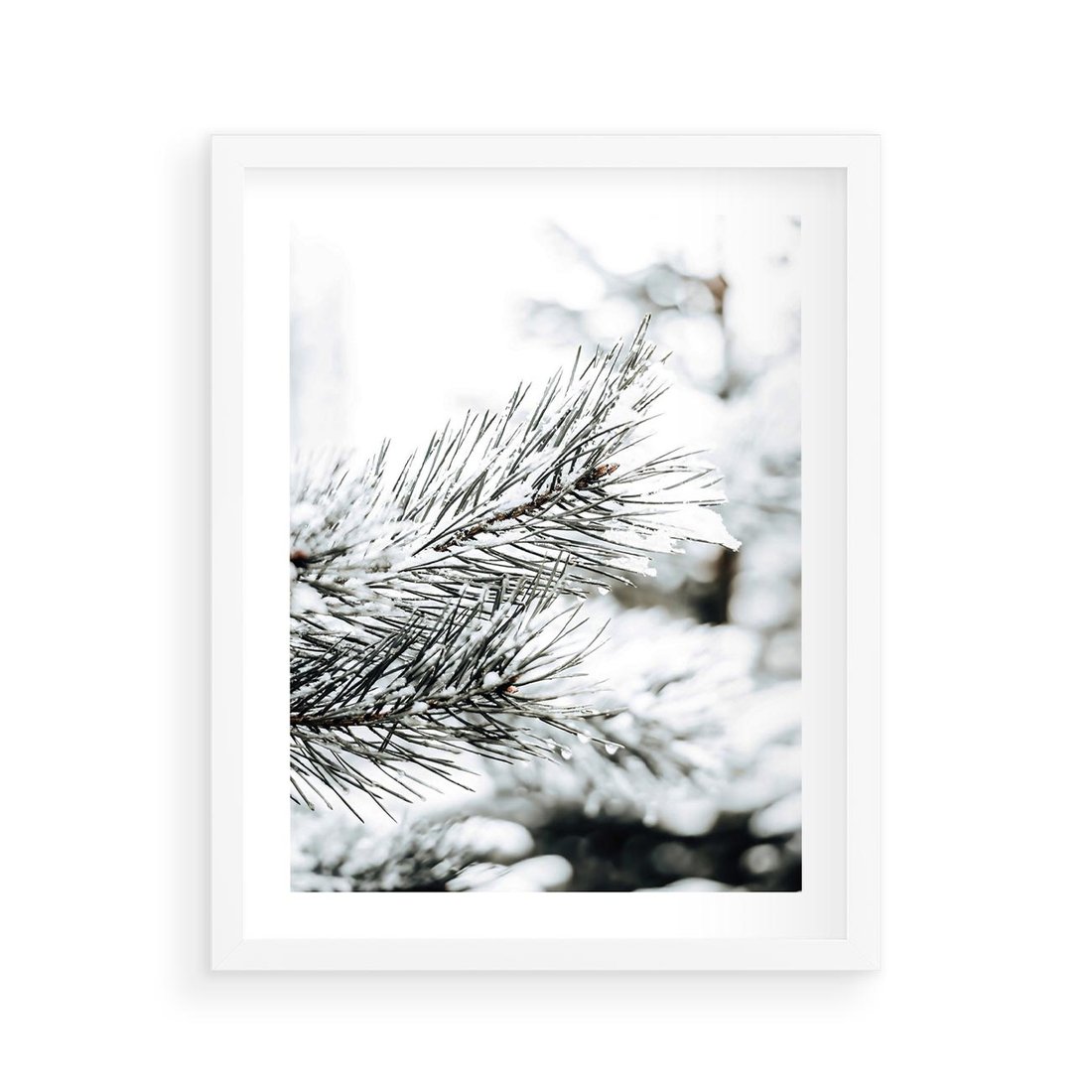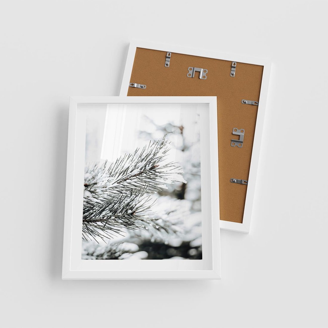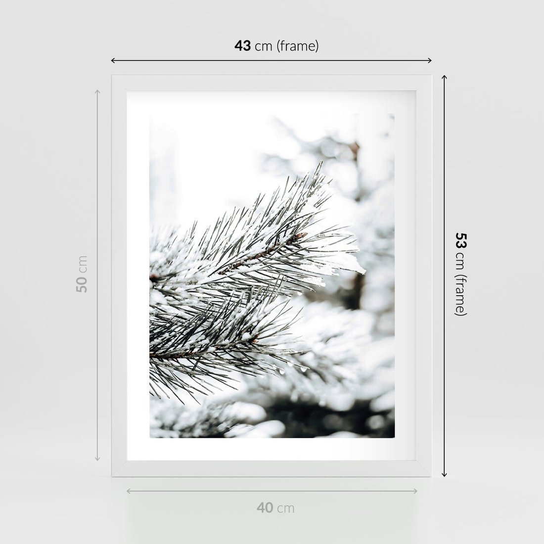 Plakat w ramie 40x50 - Chwila Zimowej Magii - iglasta gałązka, śnieg - rama biała